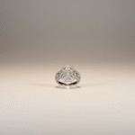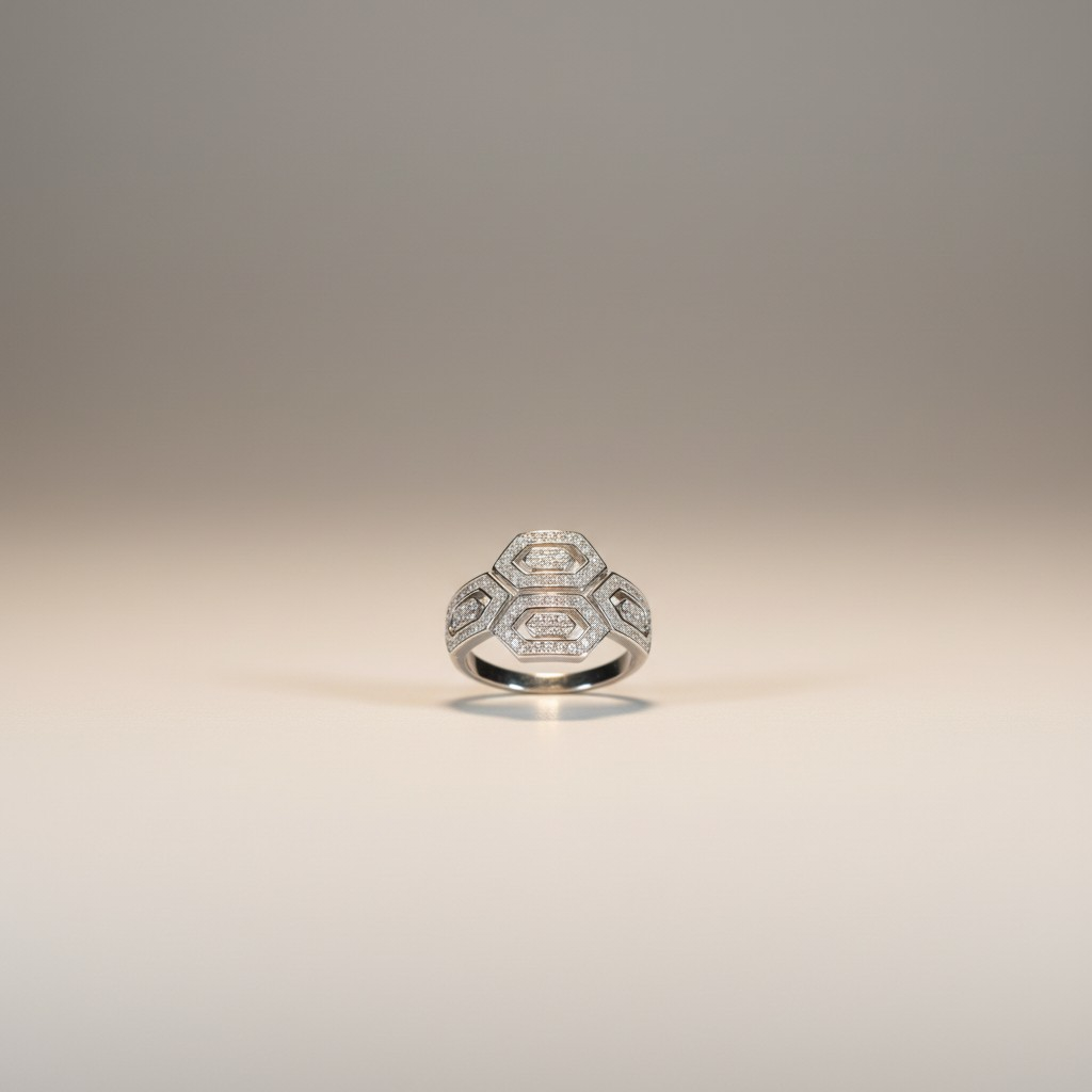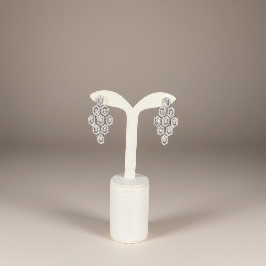 تأتي الأقراط بتصميم متناسق يعكس نفس التكوين الهندسي المميز لتمنح الإطلالة تناغماً مثالياً بين الفخامة والتوازن البصري. ويكتمل الطقم بسوار أنيق وخاتم يعكسان نفس التفاصيل الدقيقة ليظهر التصميم كوحدة فنية متكاملة تجمع بين الرقي والدقة في أدق التفاصيل.