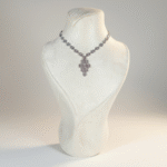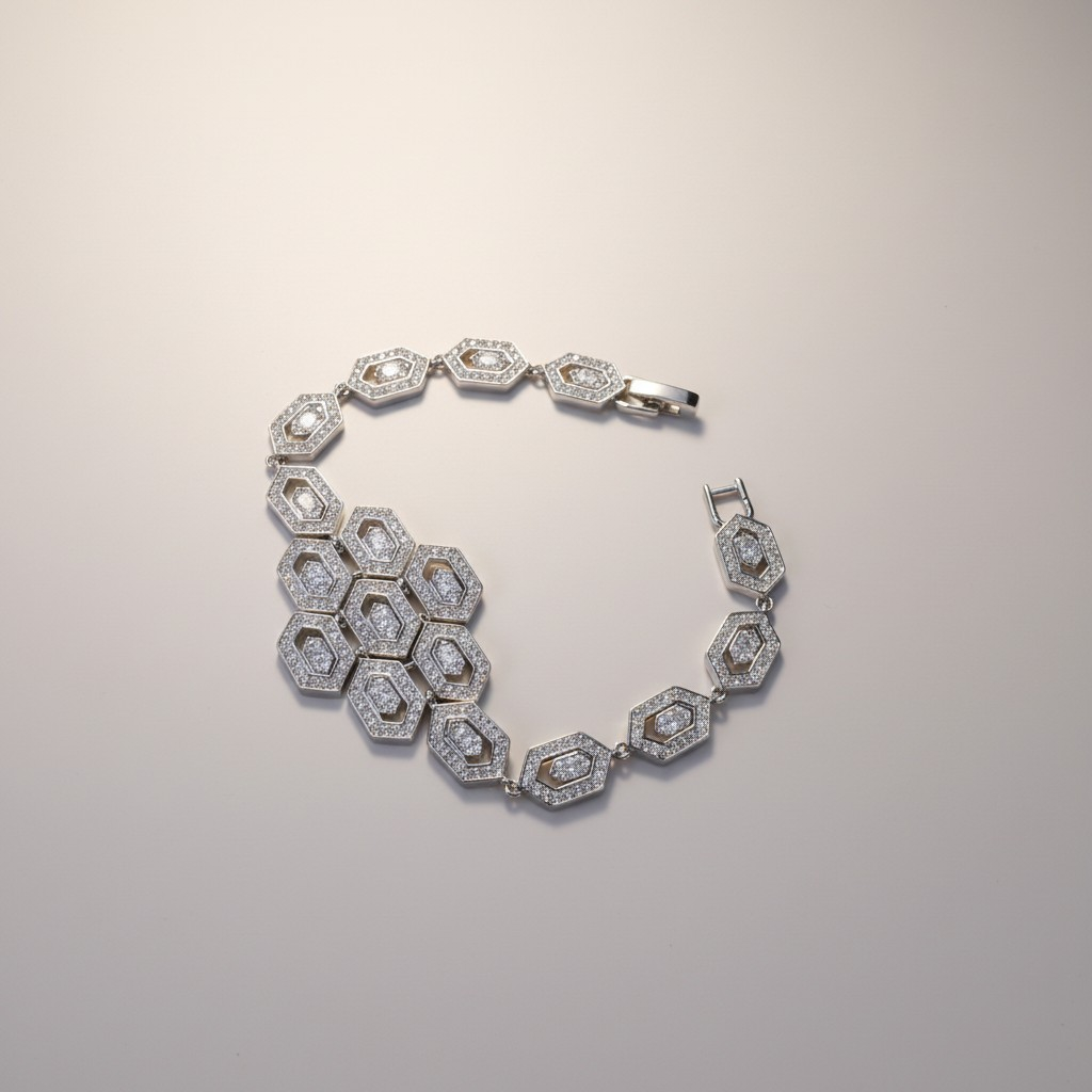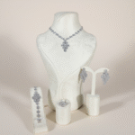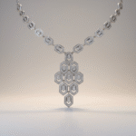 طقم فاخر مطلي بالذهب الأبيض مرصّع بأحجار زركون شفافة عالية اللمعان بتصميم هندسي راقٍ مستوحى من الزخارف الكلاسيكية الراقية. يتميز العقد بسلسلة مرصوفة بأحجار دائرية متناسقة تنتهي بتعليقة فاخرة بتصميم هندسي متداخل يمنح القطعة طابعاً معمارياً أنيقاً وبريقاً لافتاً.