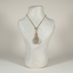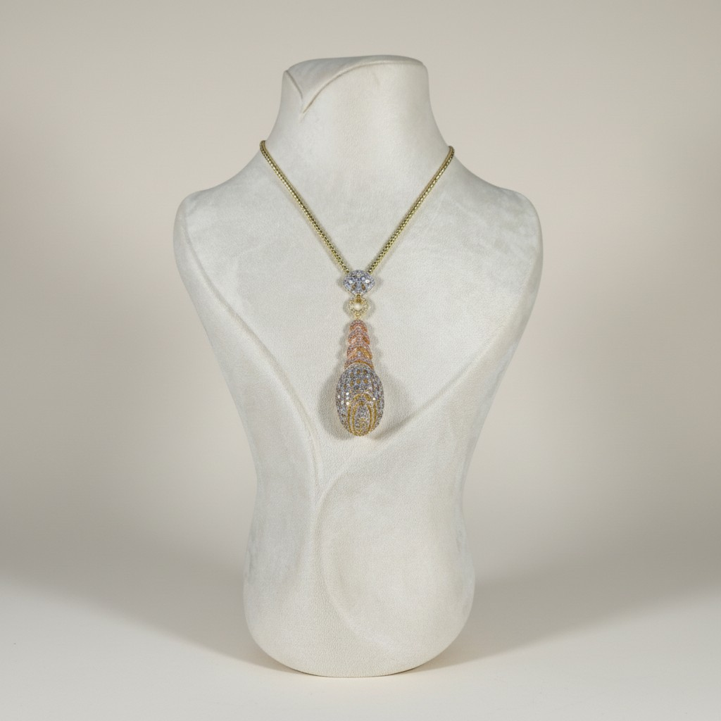تتألق التعليقة بتصميم متدرج مرصّع بدقة عالية يعكس الضوء بانسيابية جميلة، بينما تأتي الأقراط المتناسقة لتعكس نفس التفاصيل الراقية وتكمل الإطلالة بتناغم أنيق.