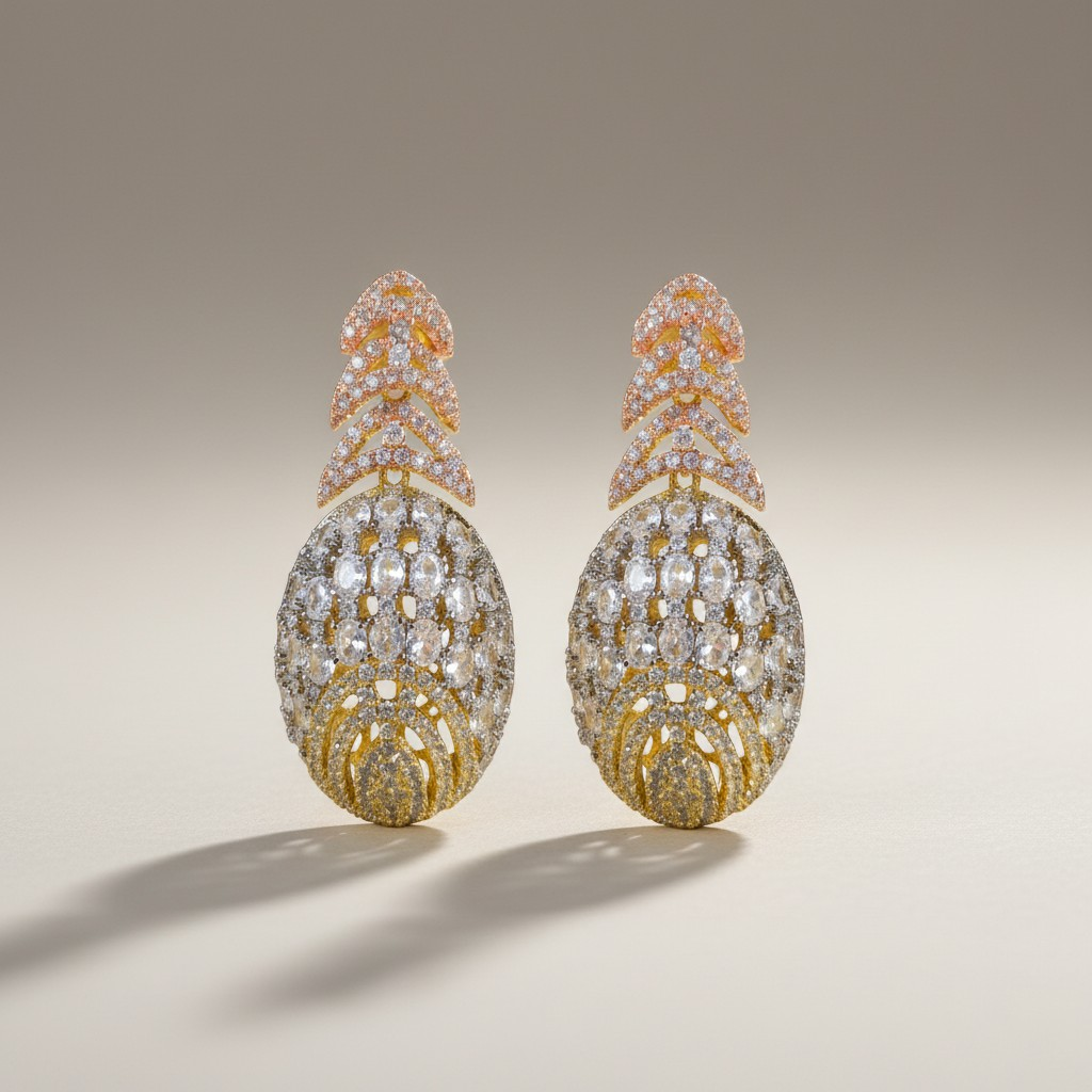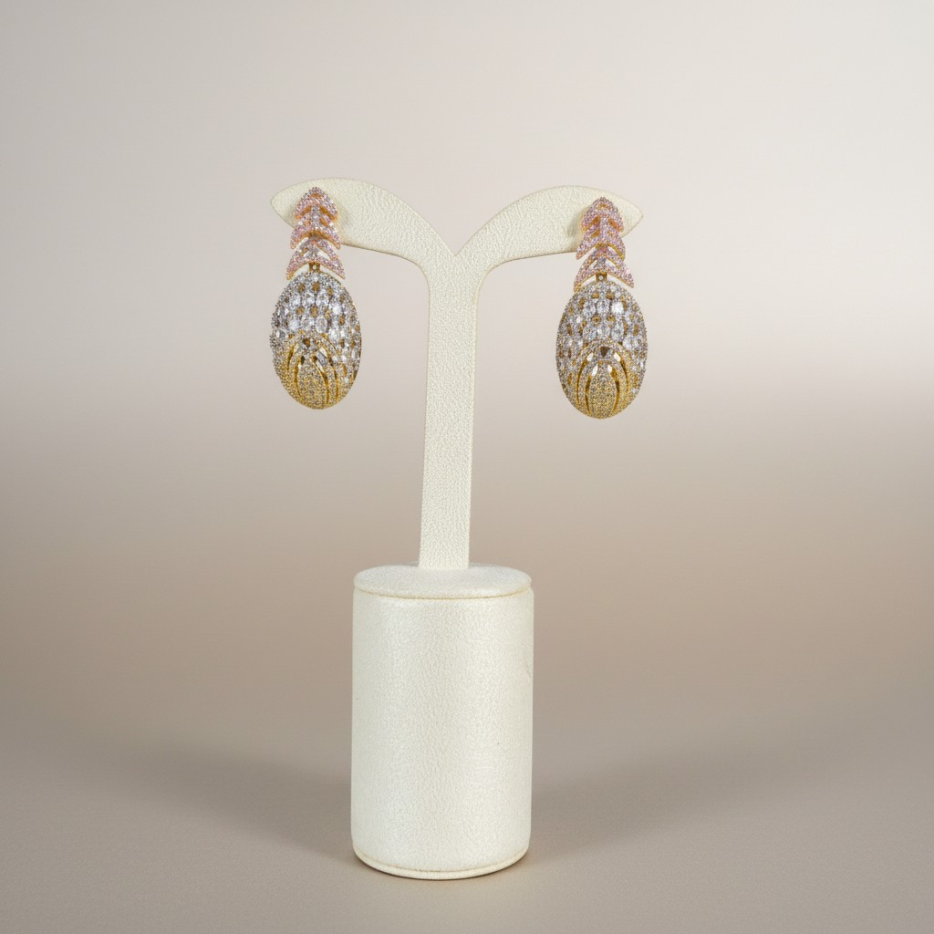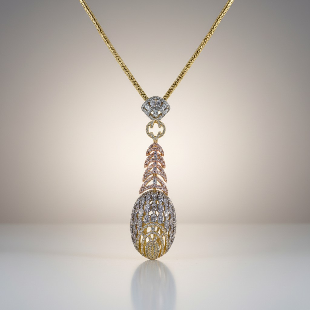 طقم أنيق مطلي ذهب عيار 18K يجمع بين دفء الذهب ولمسات الزركون المتلألئة بتدرجات ذهبية ووردية ناعمة، ليمنح التصميم إشراقة أنثوية راقية.