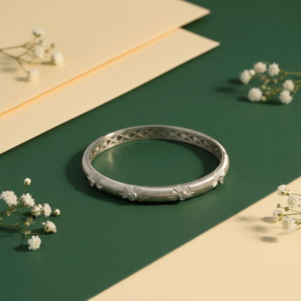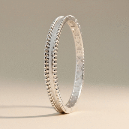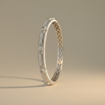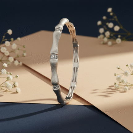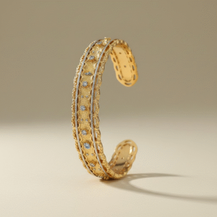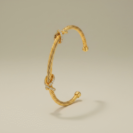 سوار مفتوح قطعة واحدة أنيقة وملفتة، حيث ينساب الشكل الملتف بسلاسة ليمنح المعصم حضورًا راقيًا، بينما تضيف الأطراف المزينة بتفاصيل مرصعة لمسة فخمة تبرز جمال التصميم من أول نظرة.