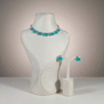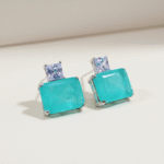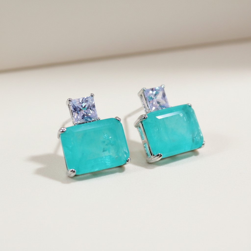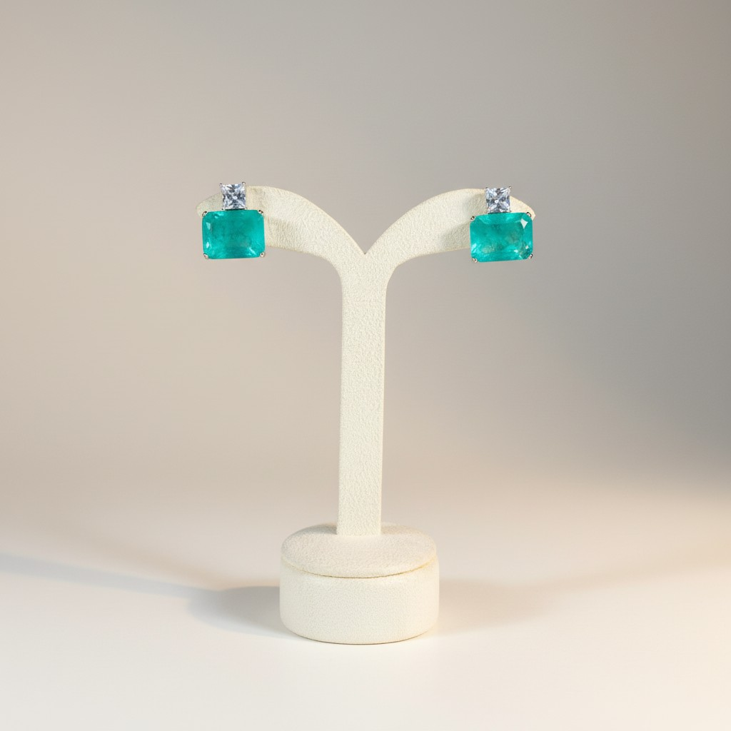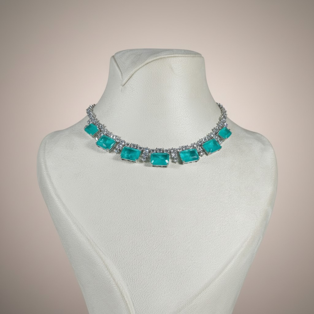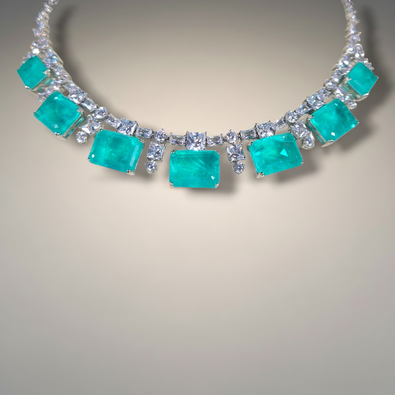 طقم فاخر مطلي بالبلاتين مستوحى من أناقة البحر الهادئة وسحر أمواجه المتلألئة. يتألق بأحجار زركون بدرجات زمردية غنية تحيط بها لمسات براقة تشبه بريق الألماس، ليعكس لمعان الشمس فوق صفحة الماء.