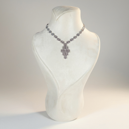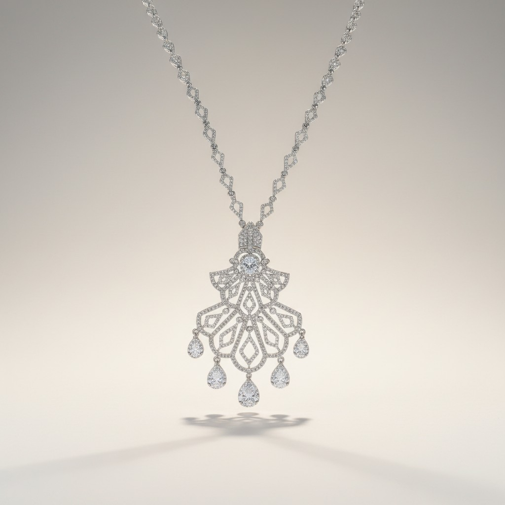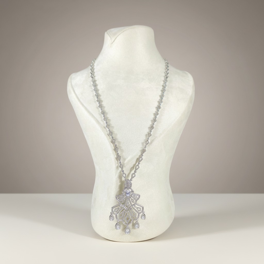 طقم فاخر مطلي بالذهب الأبيض مرصّع بأحجار زركون شفافة عالية اللمعان تعكس بريقاً يشبه الألماس. يتميز العقد بتصميم طويل مرصوف بأحجار دقيقة متناسقة تنساب حول العنق بانسيابية أنيقة، لتنتهي بتعليقة فاخرة بتفاصيل زخرفية مرصّعة تمنح القطعة حضوراً لافتاً وبريقاً متألقاً.