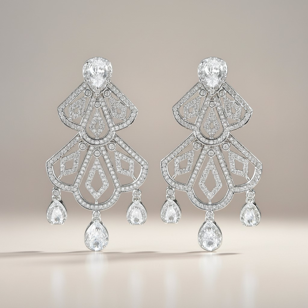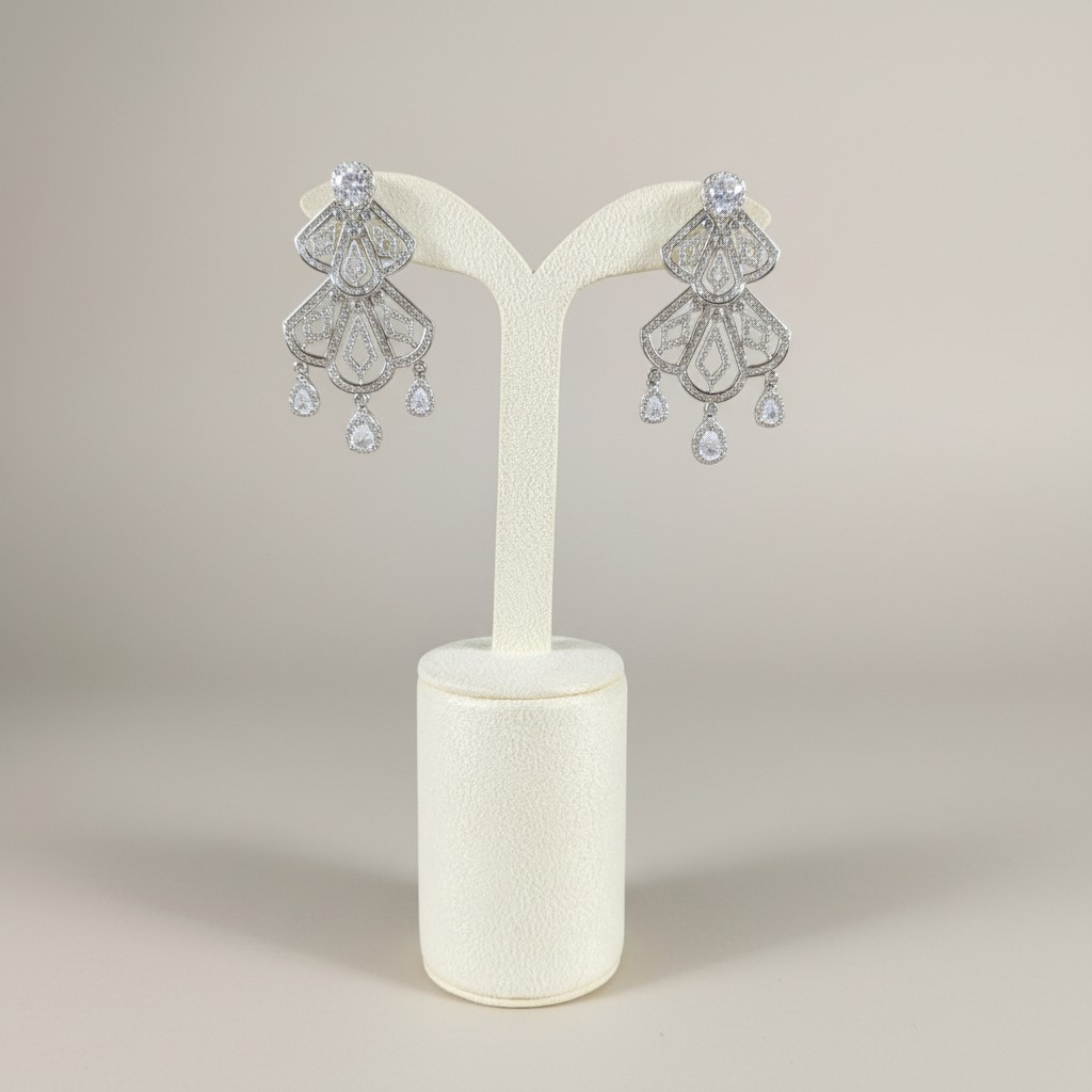 تأتي الأقراط بتصميم متناسق يعكس نفس الزخارف الفاخرة والتفاصيل المرصّعة، مع تعليقات متدلية تضيف حركة أنيقة وبريقاً مضاعفاً مع كل حركة.