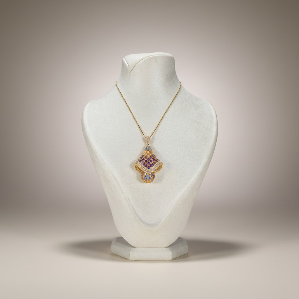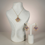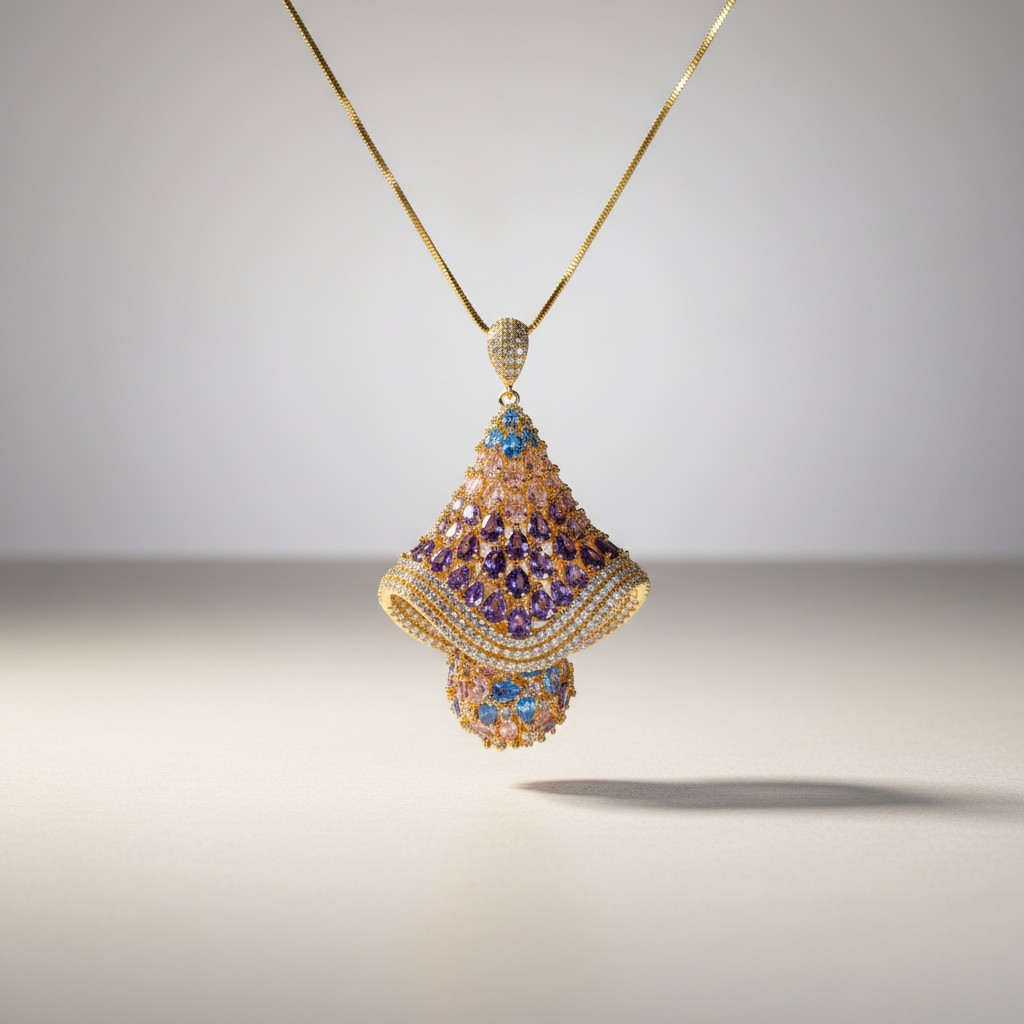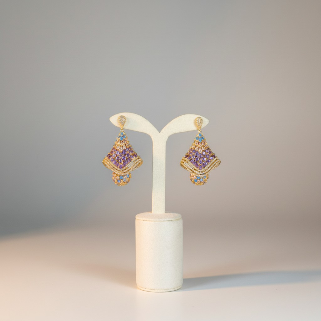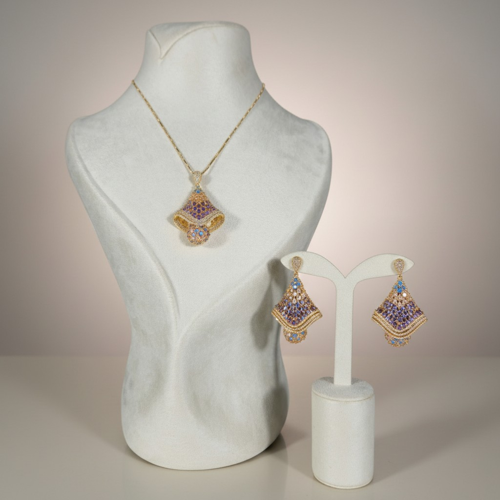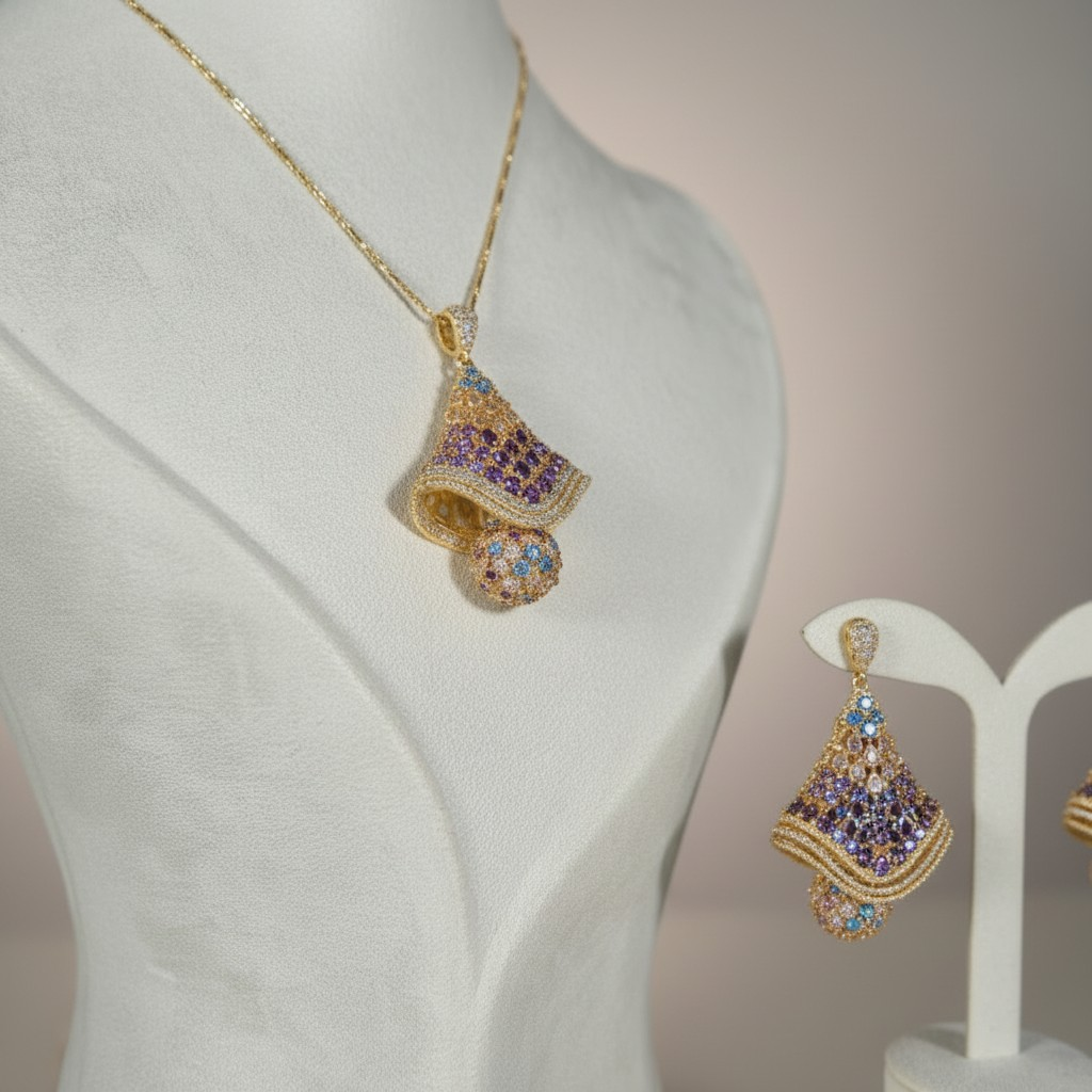 يتميز هذا الطقم الفاخر بتنسيق ساحر من أحجار زركون عالية الجودة بألوان البنفسجي والوردي والأزرق، مرصعة في تصميم متألق مطلي بالذهب. تضفي التفاصيل الدقيقة والانحناءات الناعمة لمسة من الفخامة والرقي، مما يجعله مثاليًا للمناسبات الخاصة وتجمعات رمضان.