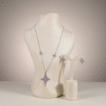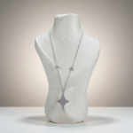 السلسال بتصميمه الطويل الأنيق ينساب بنعومة على الرقبة، ويكمّله الحلق اللي يعطي لمعة راقية تزيد جمال الإطلالة بدون ما تكون مزعجة أو مبالغ فيها.