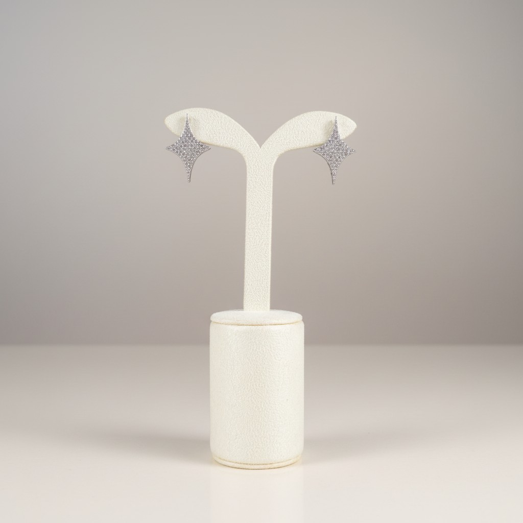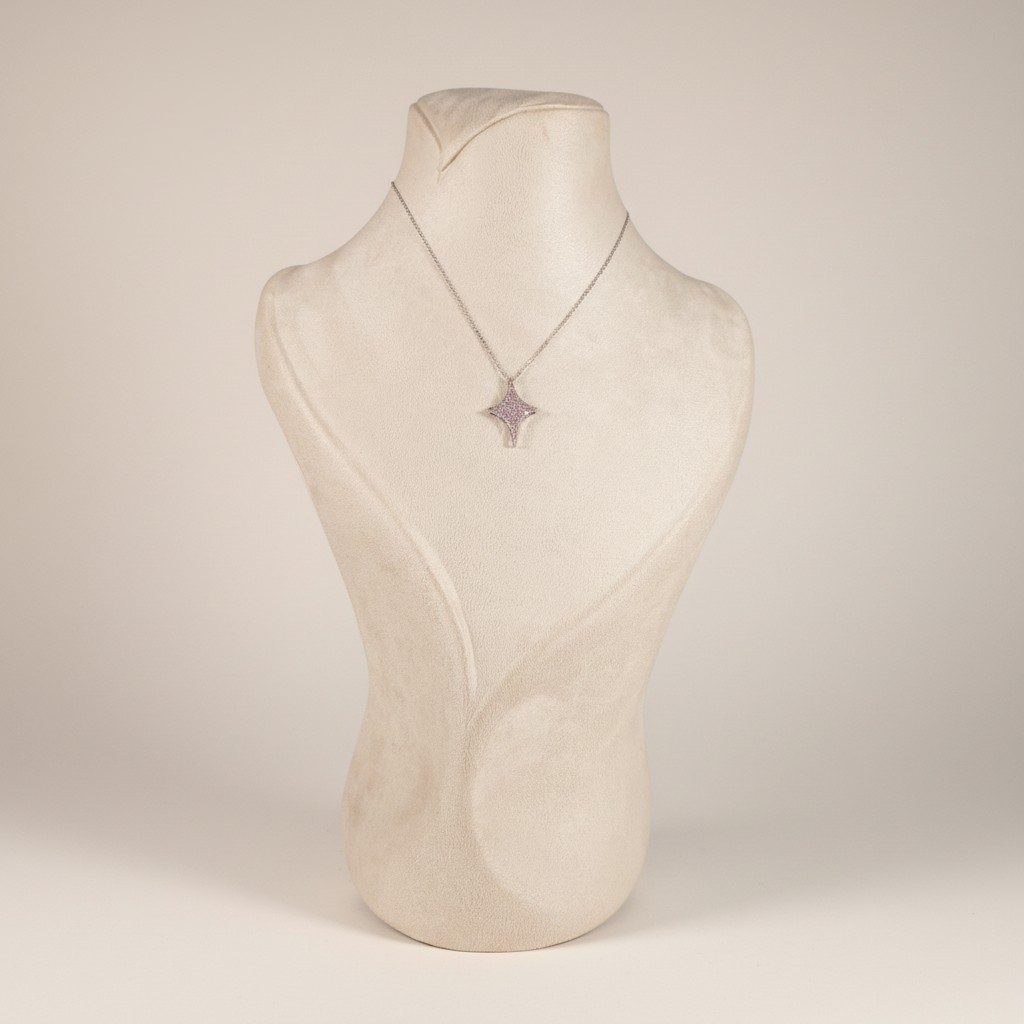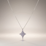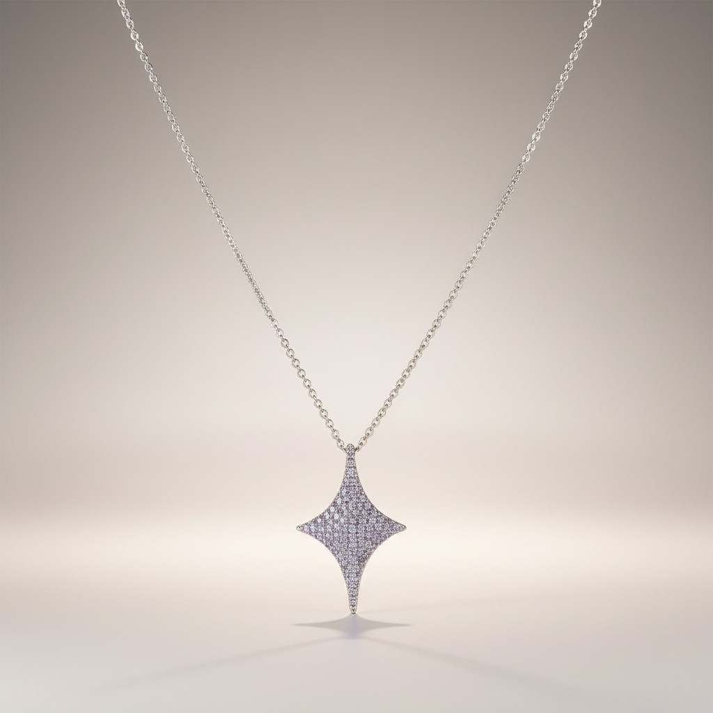 طقم سلسال قصير بتعليقة و حلق مصنوع بدقة عالية تعكس فخامة التفاصيل، وتتوزّع فيه أحجار الزركون الأصلي بترتيب يلمع مثل نجم ثابت في السما.
