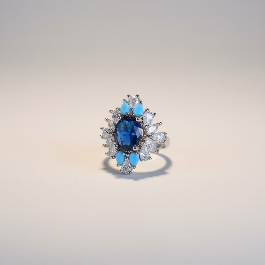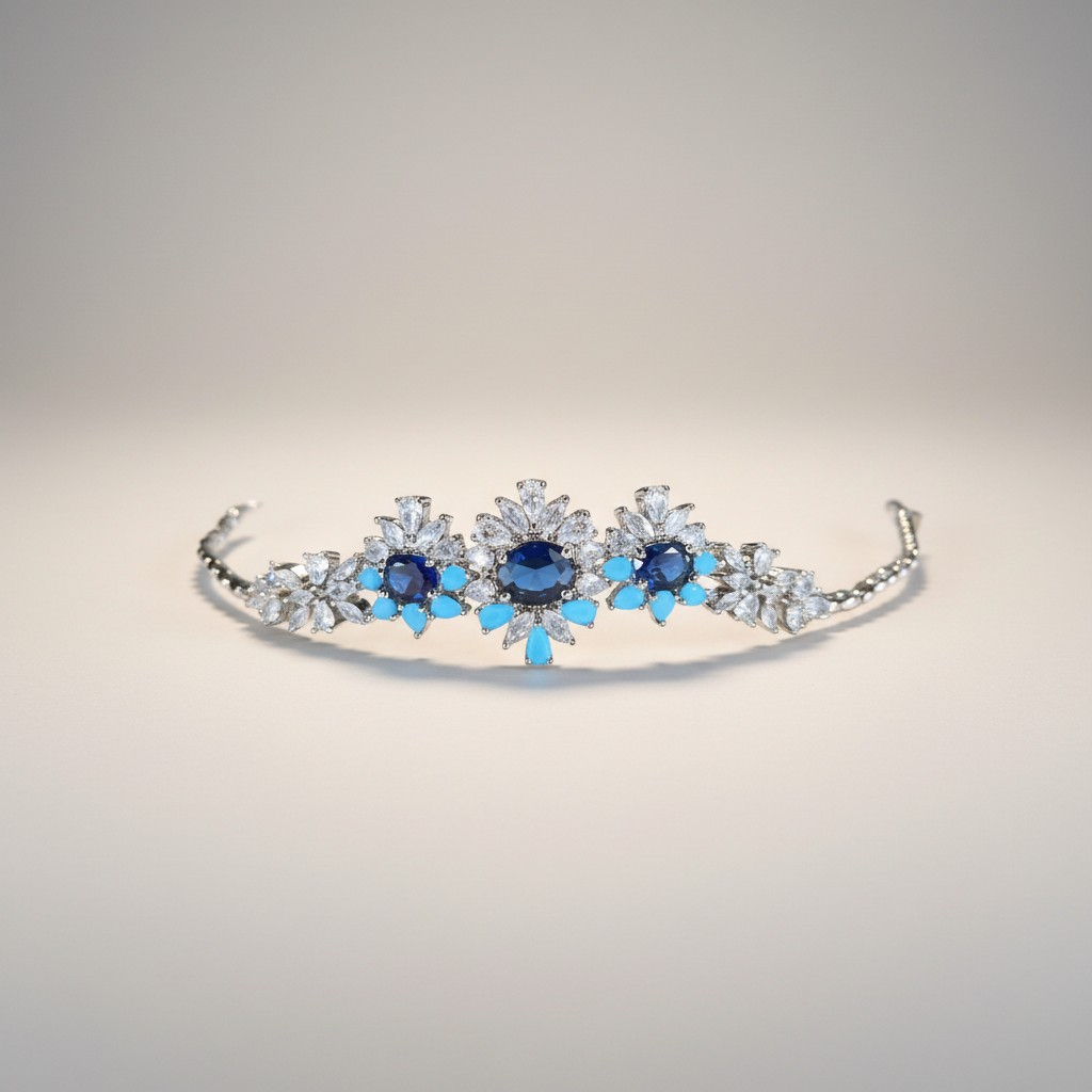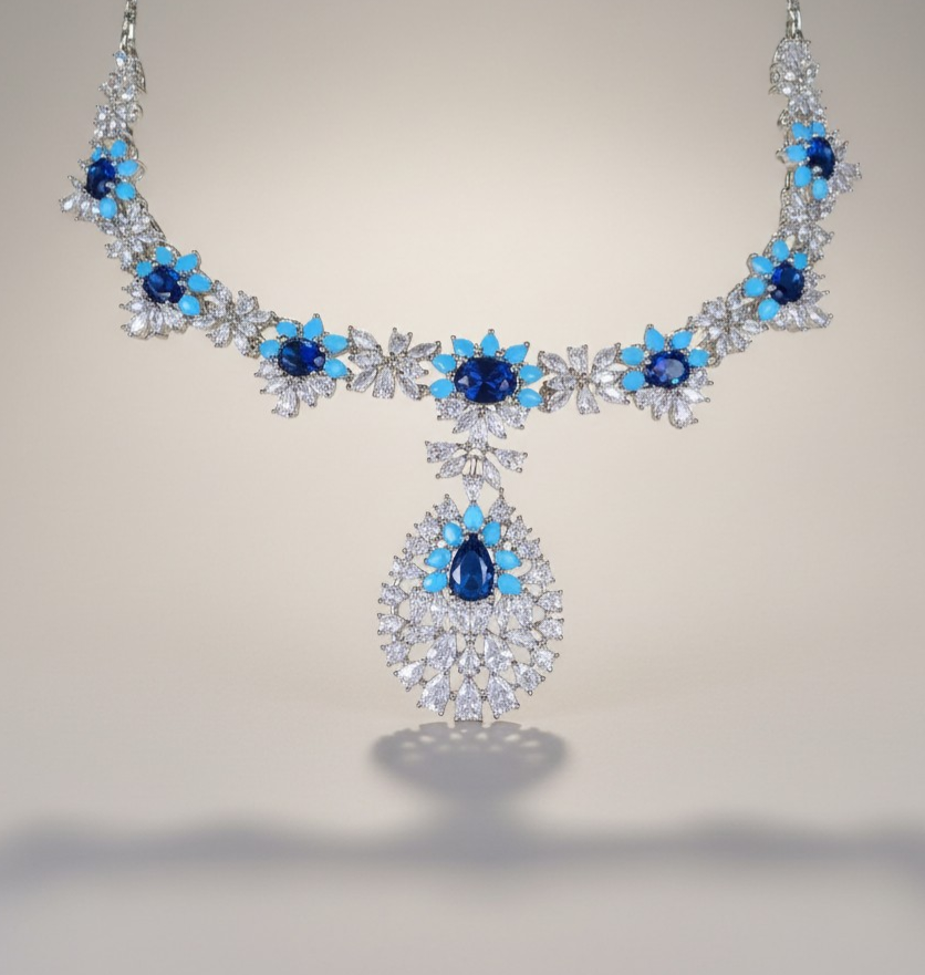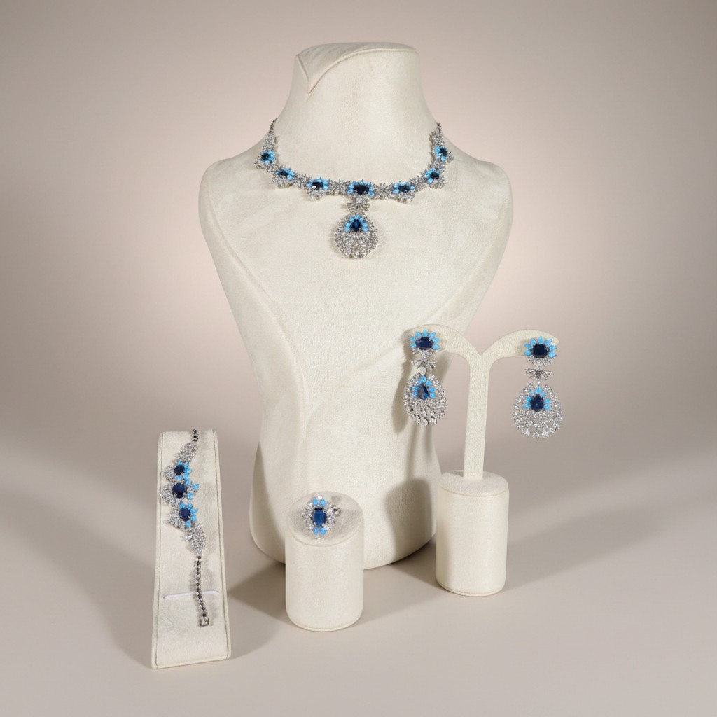 طقم فاخر متكامل يجمع بين العقد والأقراط والسوار والخاتم في تصميم ملكي يعكس الفخامة الكلاسيكية بلمسات عصرية أنيقة. يتميز العقد بتصميم مرصّع بكثافة بأحجار الزركون الشفافة التي تعكس بريقاً يشبه لمعان الألماس، وتتوسطه أحجار زرقاء عميقة محاطة بإطار من الأحجار اللامعة التي تبرز جمال اللون وتمنح القطعة حضوراً لافتاً.