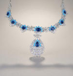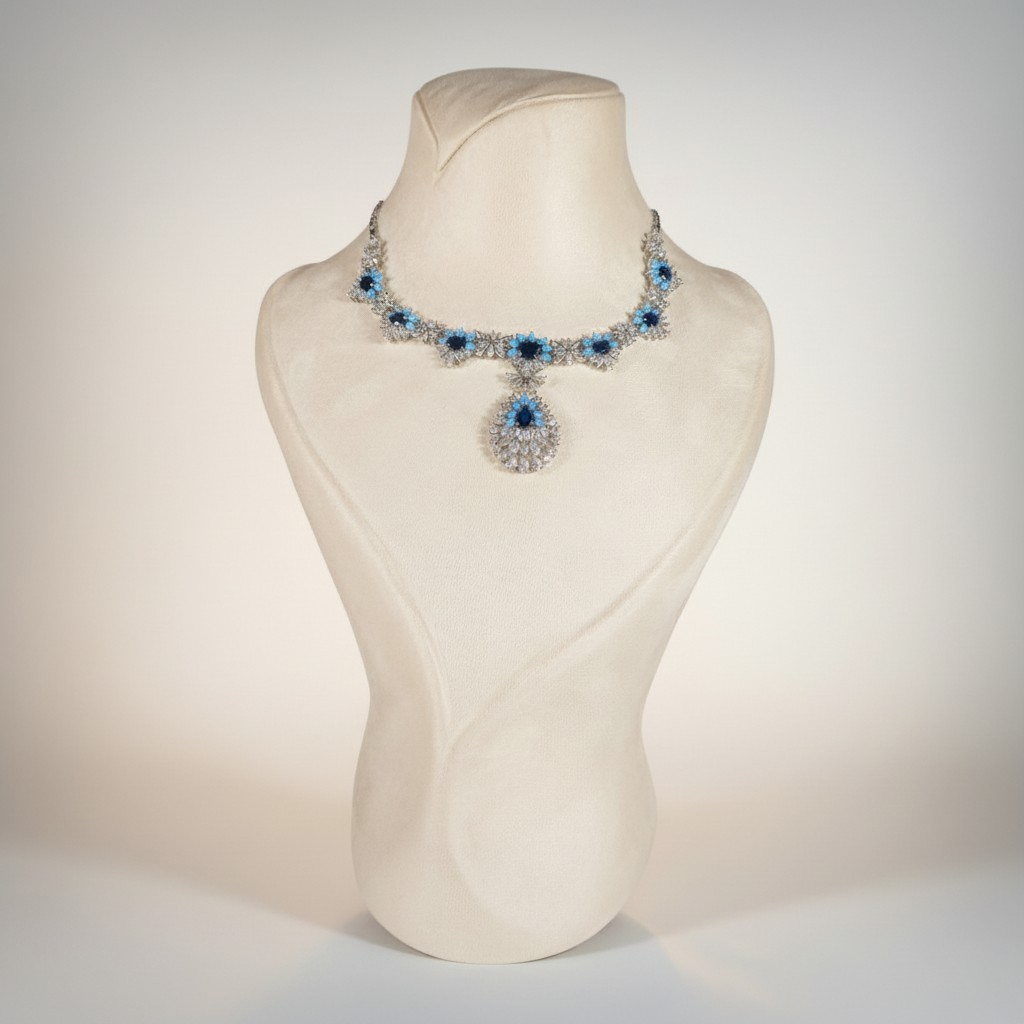 يتوسط العقد تعليقة متدلية مرصعة بالأحجار الشفافة تتزين بحجر أزرق بارز في المنتصف، ما يمنح التصميم حركة أنيقة وبريقاً متألقاً يبرز جمال الإطلالة.