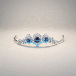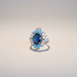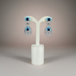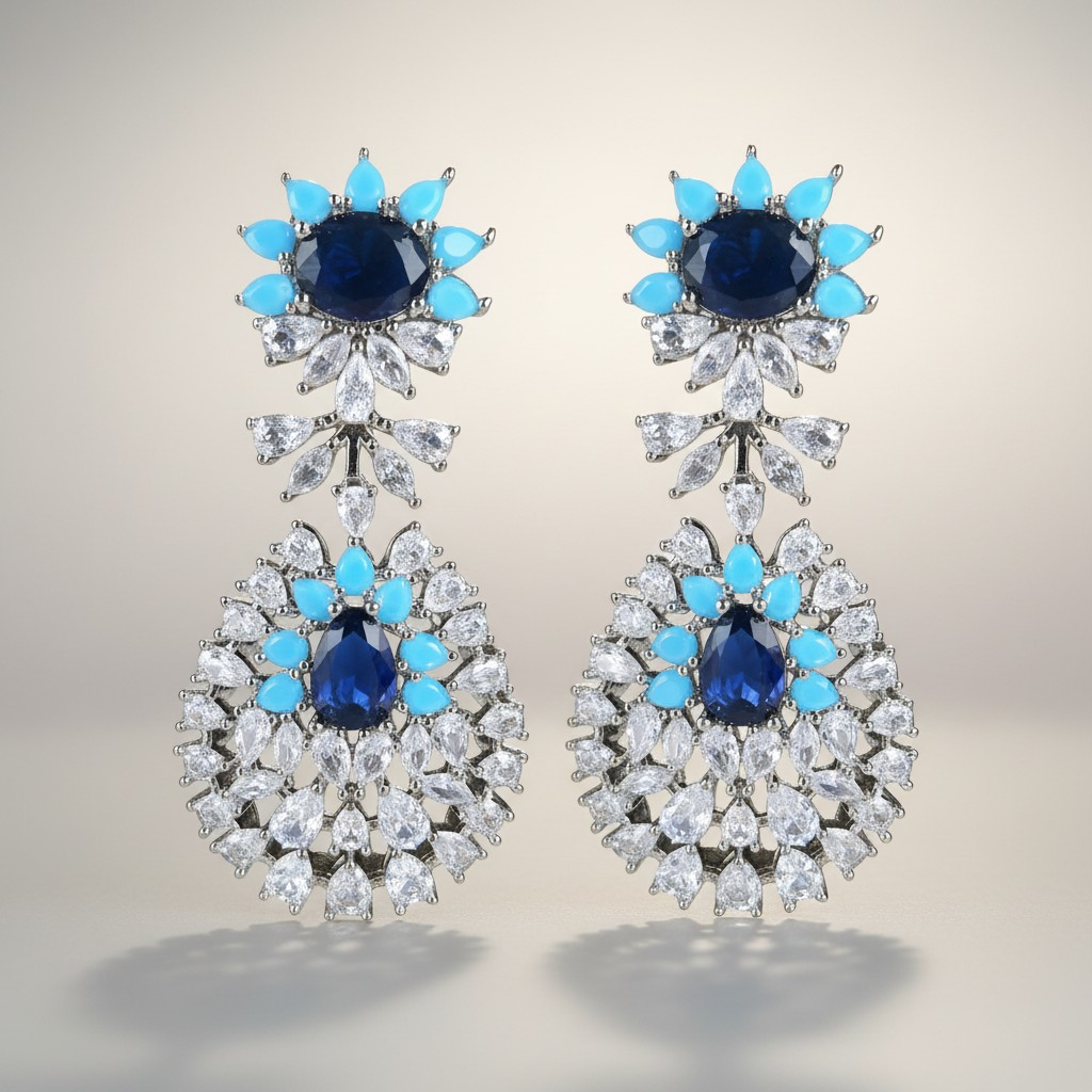 تأتي الأقراط بتصميم متدلٍ فاخر يحمل نفس تفاصيل العقد، حيث تتدرج الأحجار المرصعة نحو تعليقة أنيقة تتوسطها الأحجار الزرقاء. ويكتمل الطقم بسوار مرصع متناغم مع التصميم وخاتم فاخر يتوسطه حجر أزرق بارز يمنح الطقم تناغماً مثالياً يناسب المناسبات والسهرات الراقية.