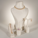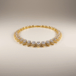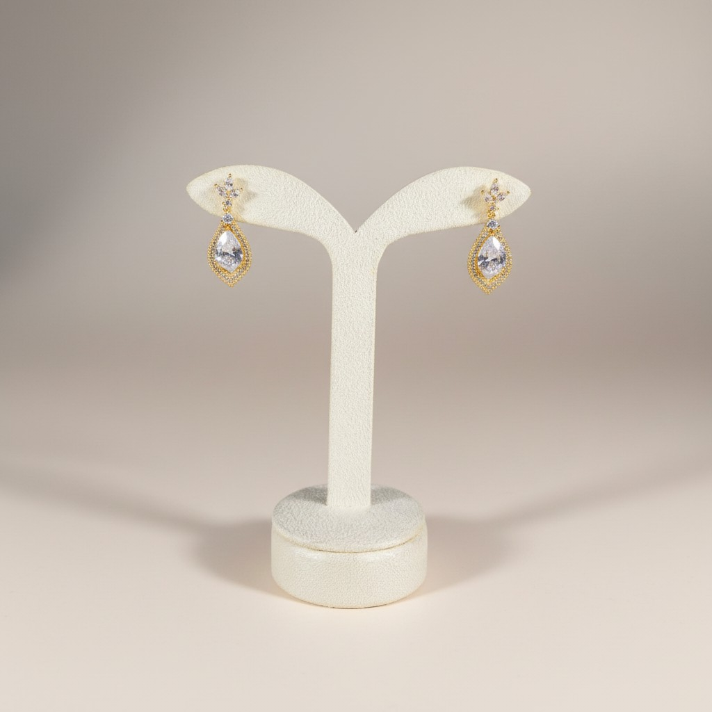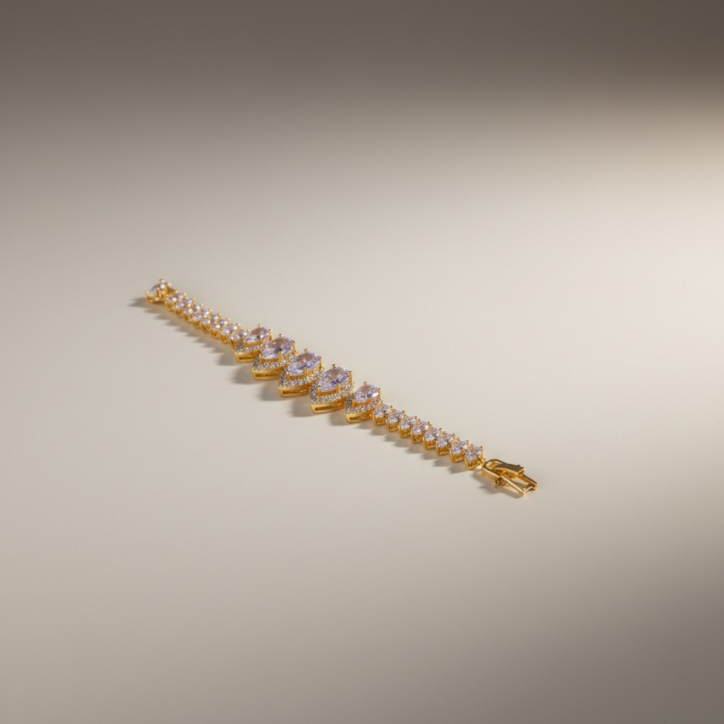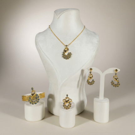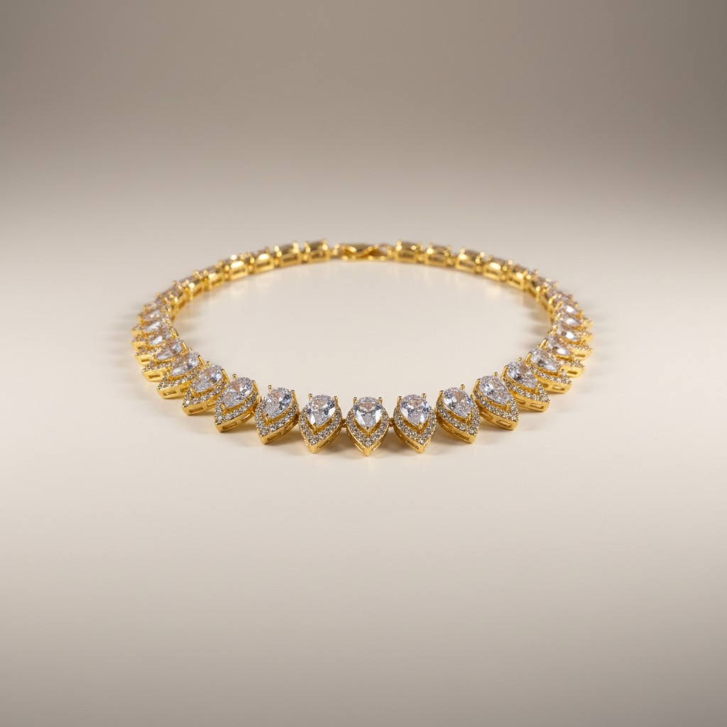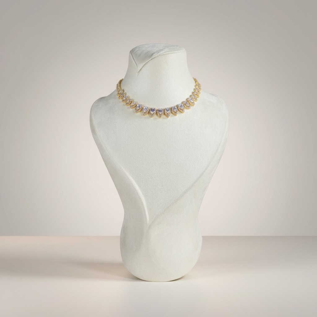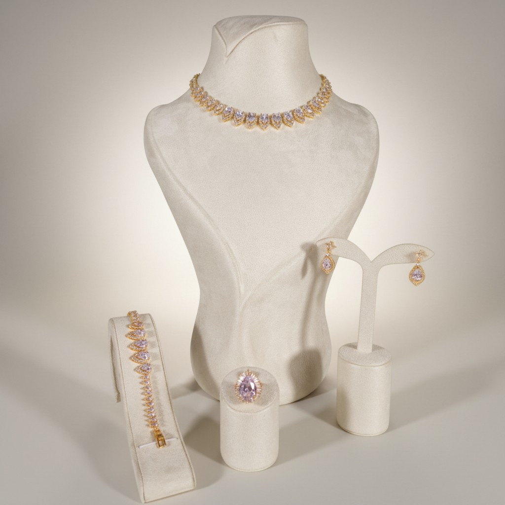 طقم فاخر مطلي بالذهب عيار 18 قيراط مرصّع بأحجار زركون متألقة بتدرجات بنفسجية ناعمة تمنح التصميم إشراقة أنثوية راقية. يتكون الطقم من أربع قطع متناسقة: عقد قصير بتصميم متدرّج من الأحجار البيضاوية المرصوفة بعناية ليعكس بريقاً متواصلاً حول العنق، مع أقراط أنيقة تحمل نفس الحجر البنفسجي المتألق.