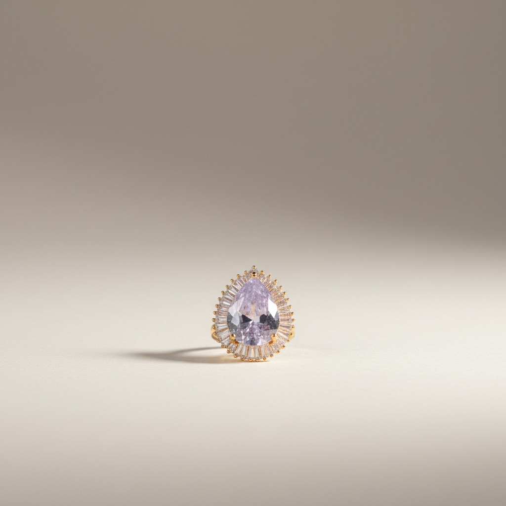 ويكتمل الطقم بسوار مرصّع بتصميم متناسق يمنح المعصم لمسة فخامة ناعمة، إضافة إلى خاتم بحجر مركزي بنفسجي محاط بإطار من الزركون اللامع ليبرز جمال القطعة ويمنحها حضوراً مميزاً.