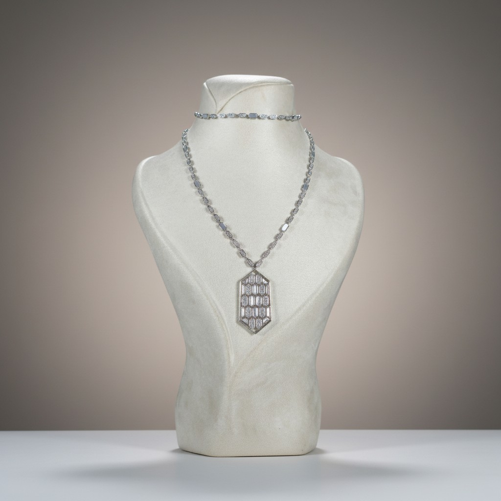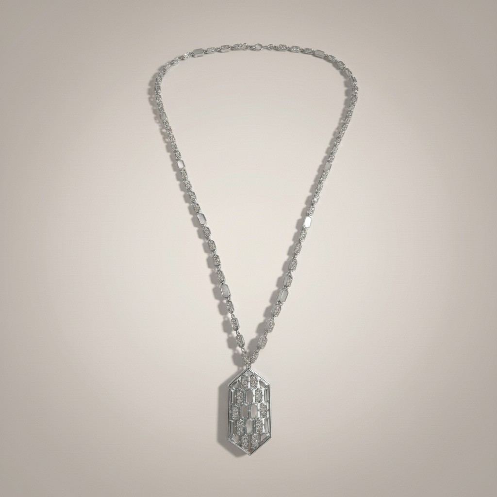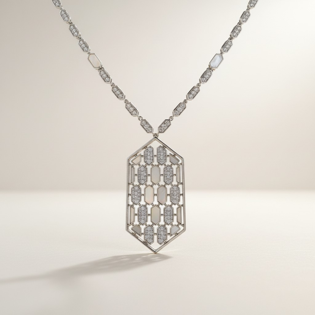 طقم مطلي بلاتين بتصميم هندسي أنيق، يتكوّن من عقد بتفاصيل سداسية متناسقة وتعليقة مركزية مرصّعة بأحجار الزركون عالية اللمعان ولمسات لؤلؤية ناعمة تضيف عمقًا راقيًا للقطعة. تصميم عصري يوازن بين الجرأة والرقي، مثالي لإطلالات المساء والمناسبات الخاصة. مقاوم لتغيّر اللون ومناسب للبشرة الحساسة.