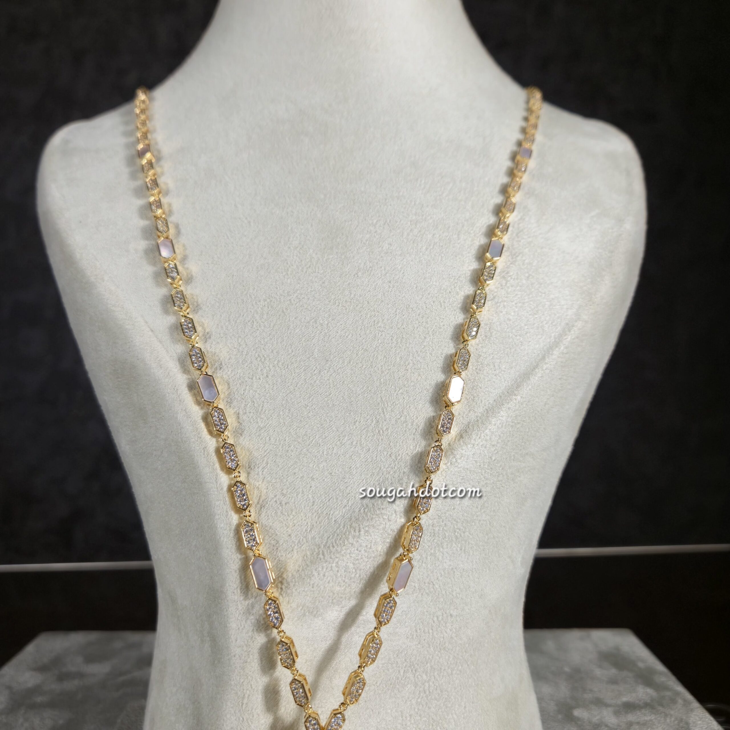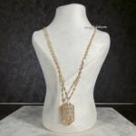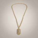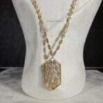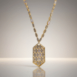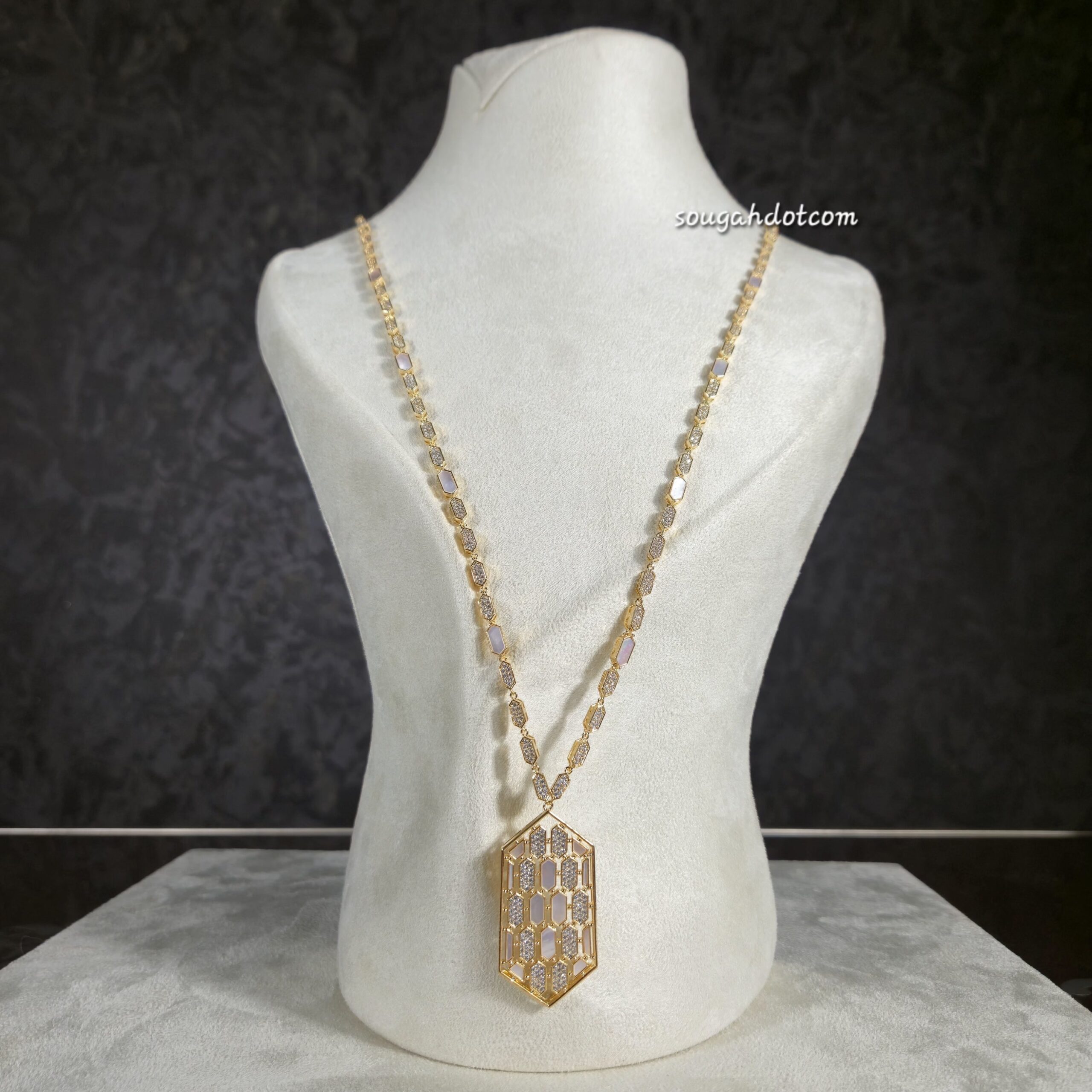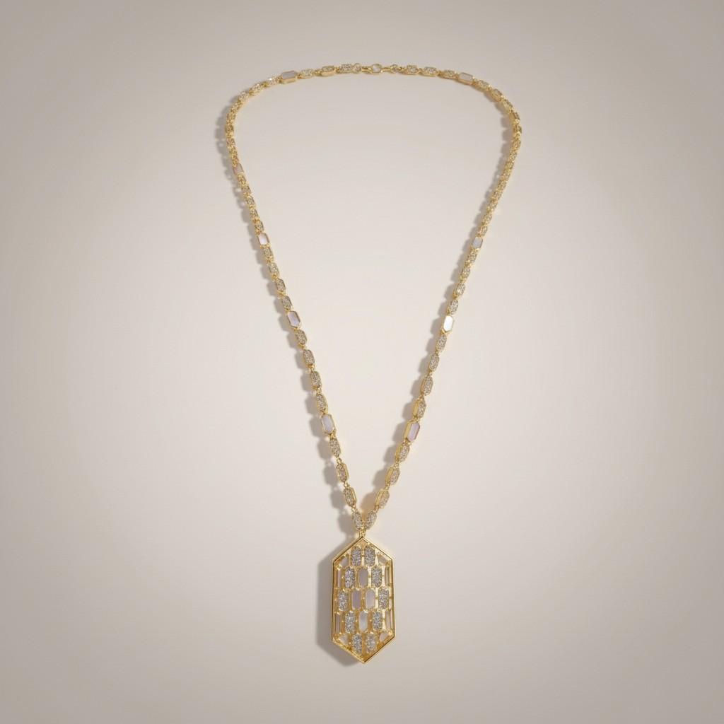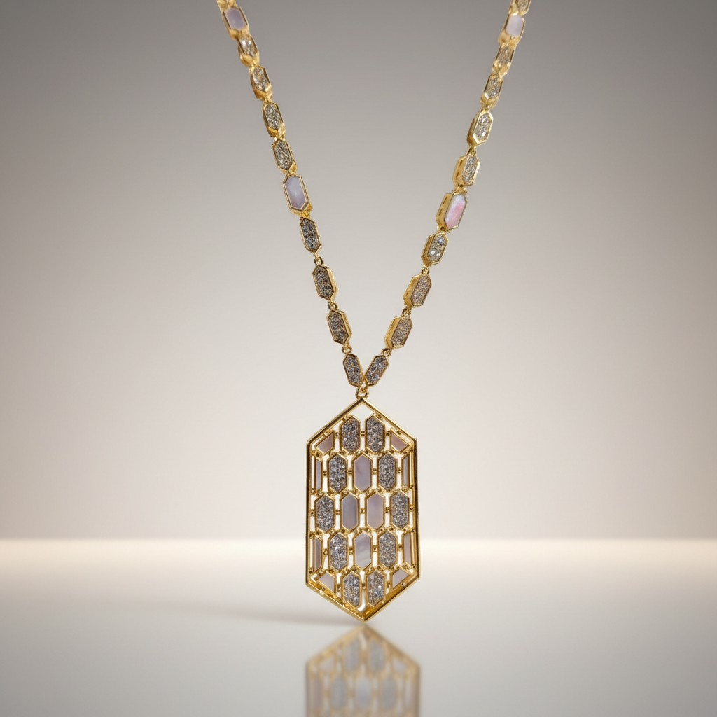 طقم مطلي ذهب بتصميم هندسي أنيق، يتكوّن من عقد بتفاصيل سداسية متناسقة وتعليقة مركزية مرصّعة بأحجار الزركون عالية اللمعان ولمسات لؤلؤية ناعمة تضيف عمقًا راقيًا للقطعة. تصميم عصري يوازن بين الجرأة والرقي، مثالي لإطلالات المساء والمناسبات الخاصة. مقاوم لتغيّر اللون ومناسب للبشرة الحساسة.