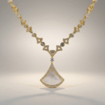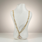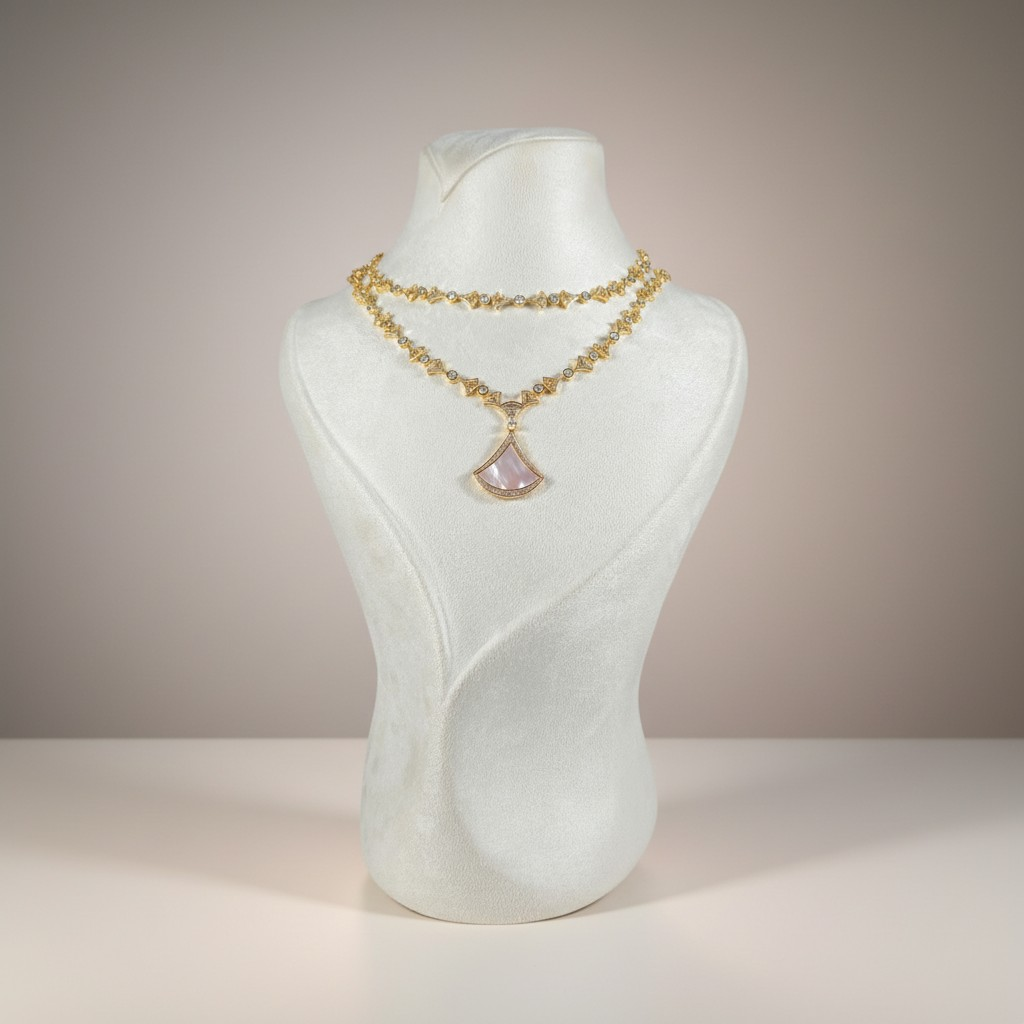 تتوزع التفاصيل المرصّعة بتناغم دقيق على طول السلسلة، لتنتهي بقلادة ناعمة تضيف لمسة أنثوية راقية.