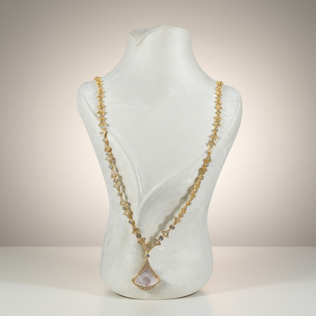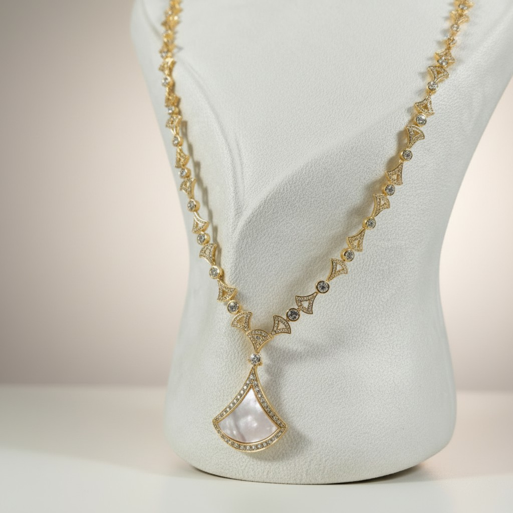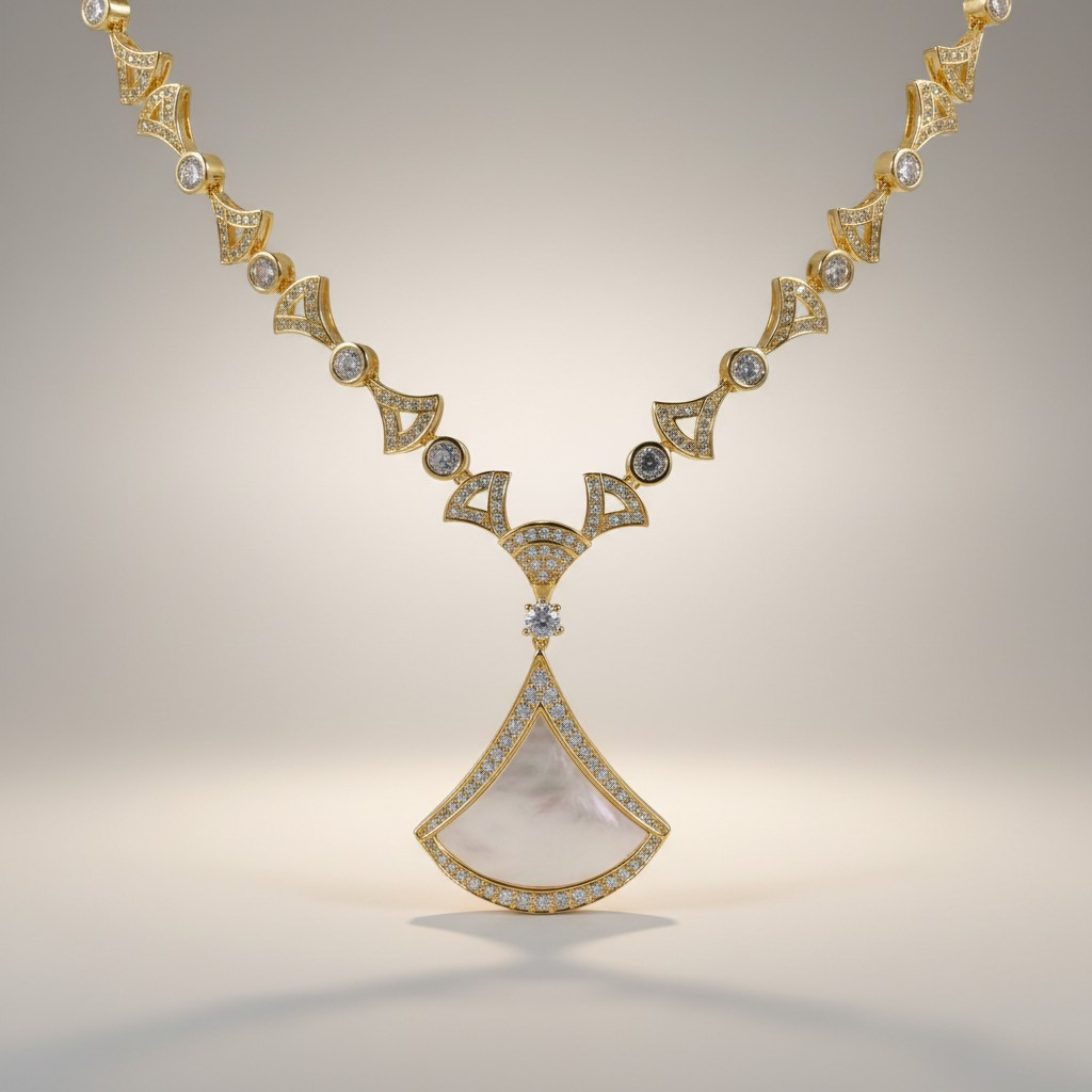 عقد فاخر مطلي بالذهب، مرصّع بأحجار الزركون عالية الجودة بتصميم انسيابي متدرج يمنح الرقبة طولاً وأناقة لافتة.