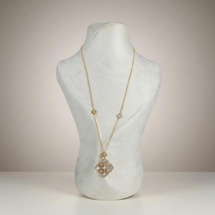 تتوزع التفاصيل المرصّعة بتناغم دقيق على طول السلسلة، لتنتهي بقلادة ناعمة تضيف لمسة أنثوية راقية.