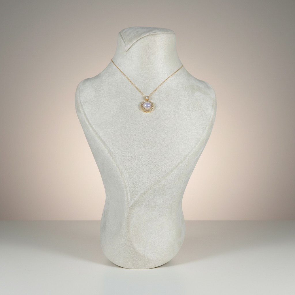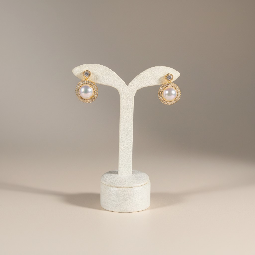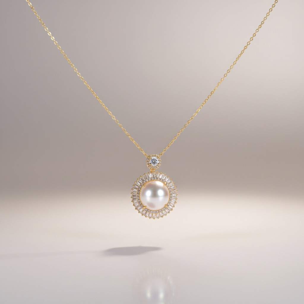 طقم فاخر مطلي بالذهب عيار 18 قيراط يجمع بين نعومة اللؤلؤ الطبيعي وبريق أحجار الزركون المرصوفة بدقة عالية. يتوسط العقد حجر لؤلؤ أنيق تحيط به هالة دقيقة من الزركون اللامع تمنحه إشراقة راقية تعكس الضوء بأسلوب فخم وهادئ.