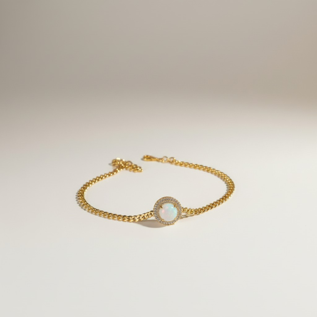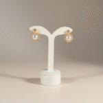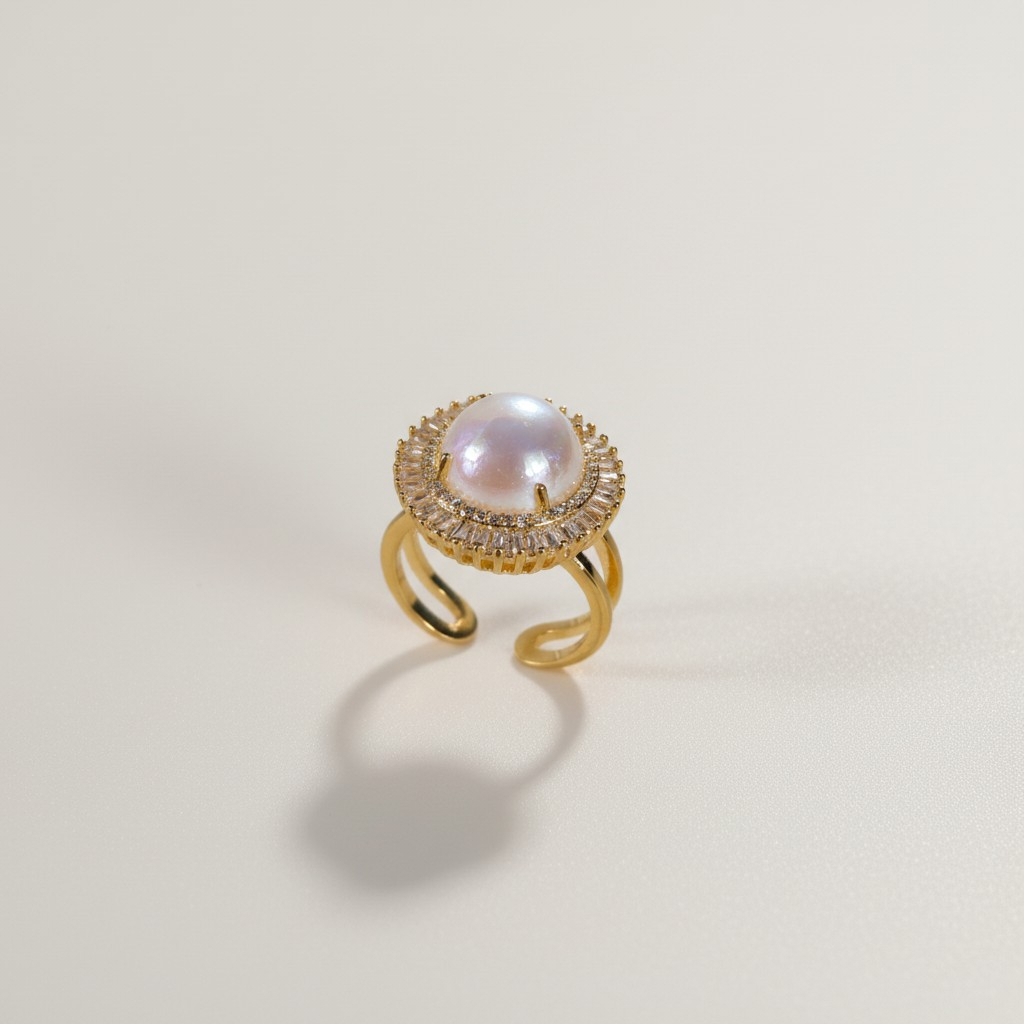 تأتي الأقراط بتصميم متناسق يحمل نفس اللؤلؤة المحاطة بإطار مرصّع يمنح الإطلالة توازناً مثالياً بين الفخامة والبساطة. ويكتمل الطقم بسوار أنيق وخاتم بتصميم مفتوح قابل للتعديل، يحملان نفس التفاصيل الراقية ليعكسا تناغماً جمالياً في كل قطعة.