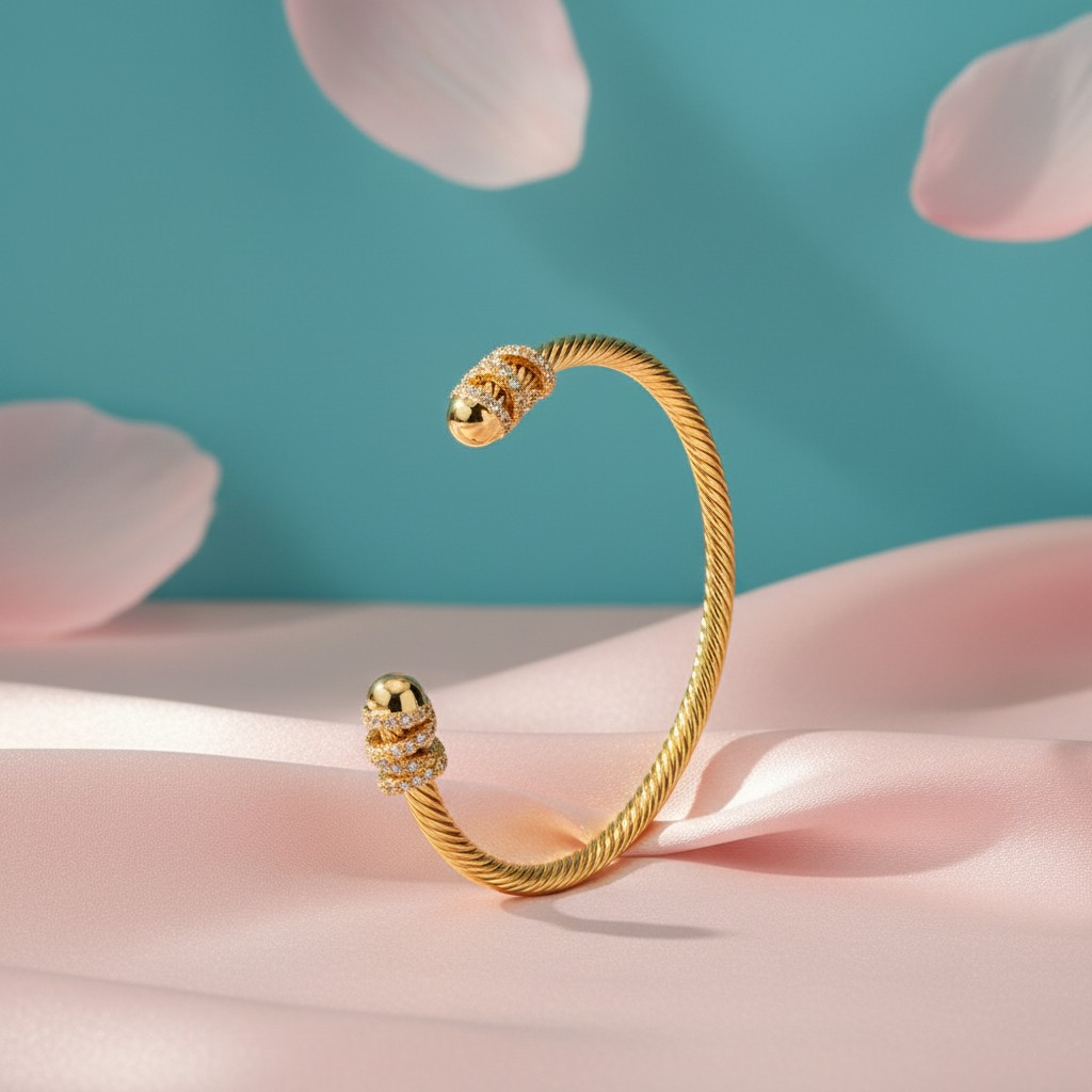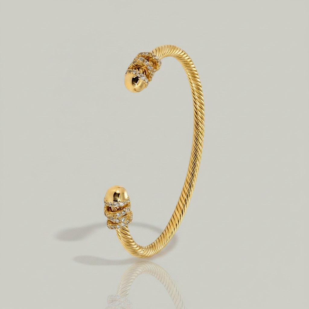 سوار مفتوح بتصميم فاخر مستوحى من الخطوط الملتفة الراقية، يجمع بين نعومة الذهب وحضور التفاصيل المرصعة في الأطراف بأسلوب أنيق وهادئ. يمنحك هذا التصميم توازنًا جميلًا بين البساطة الراقية والفخامة الواضحة، ليكون قطعة مميزة تناسب الإطلالات اليومية الراقية والمناسبات الخاصة.