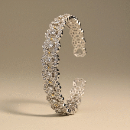 سوار مفتوح بتصميم فاخر مستوحى من الخطوط الملتفة الراقية، يجمع بين نعومة الذهب وحضور التفاصيل المرصعة في الأطراف بأسلوب أنيق وهادئ. يمنحك هذا التصميم توازنًا جميلًا بين البساطة الراقية والفخامة الواضحة، ليكون قطعة مميزة تناسب الإطلالات اليومية الراقية والمناسبات الخاصة.