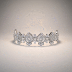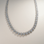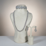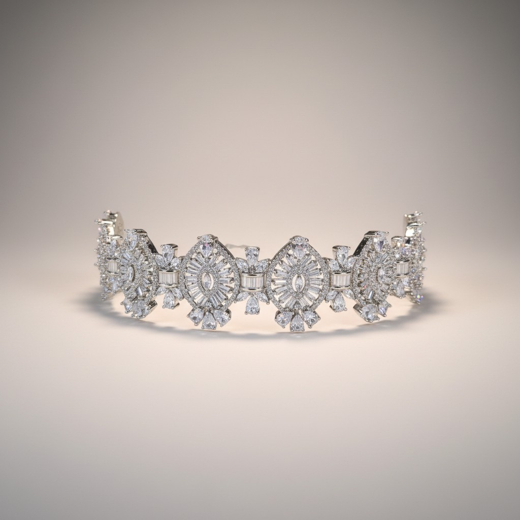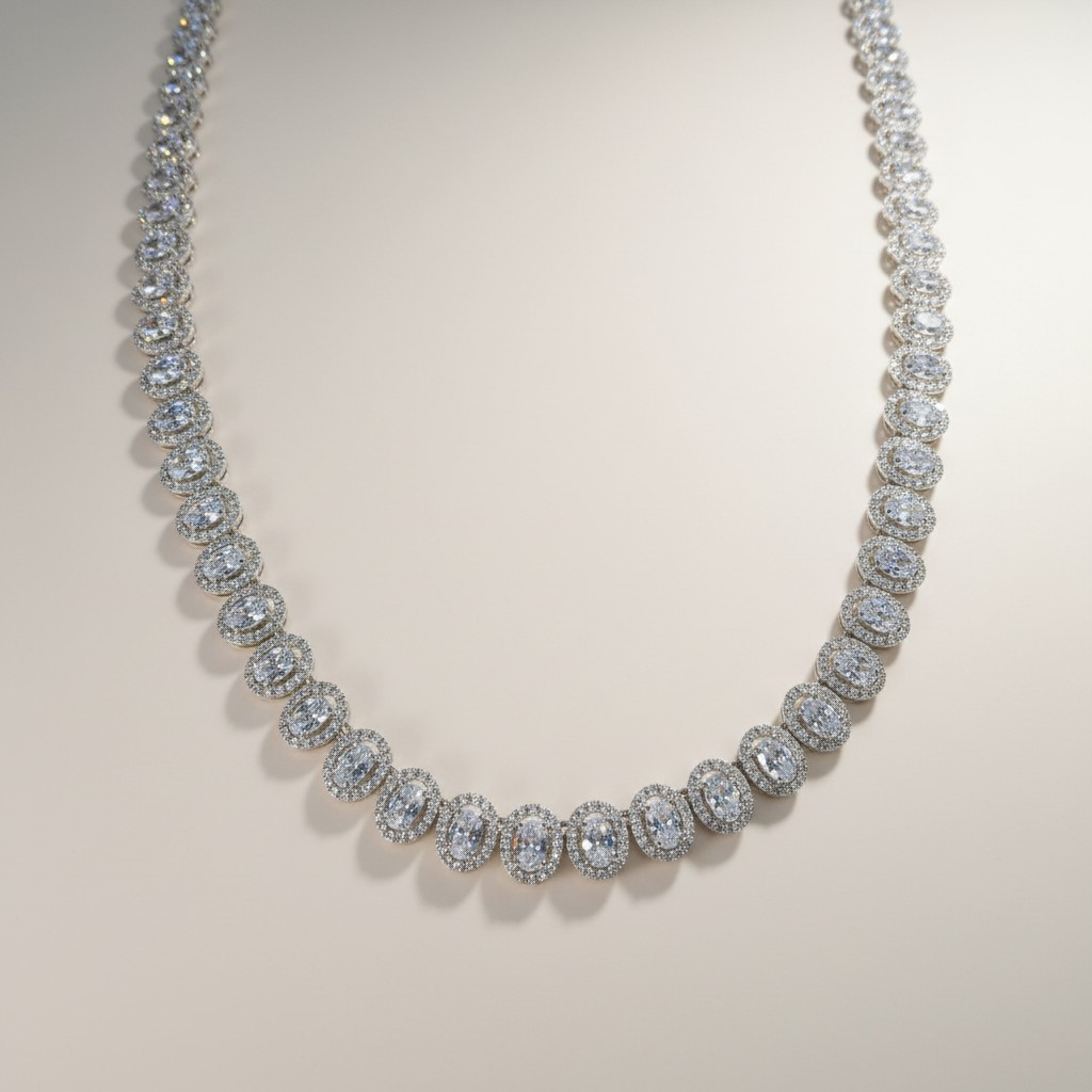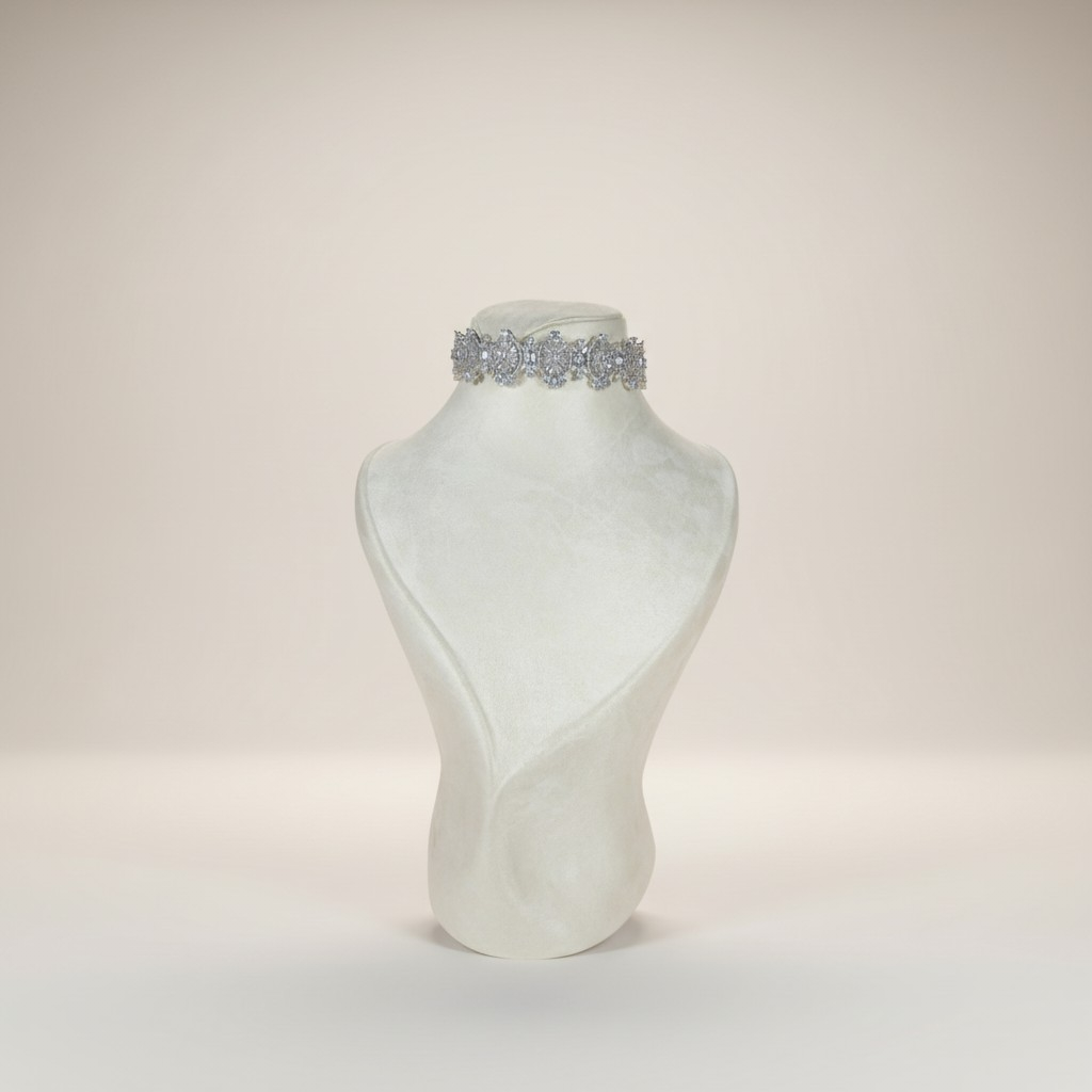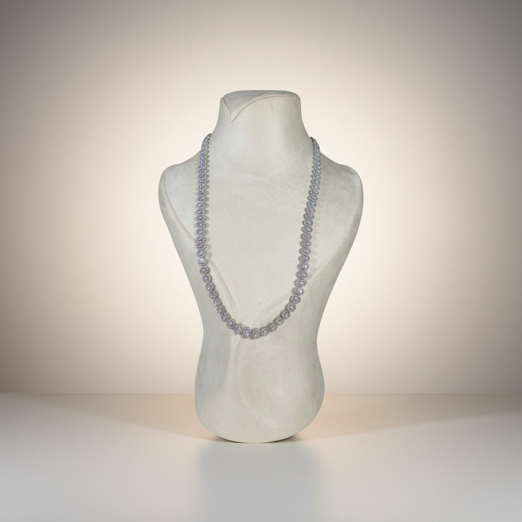 يتألف العقد الطويل من صف متناسق من الأحجار الدائرية المرصوفة بدقة، يمنح القطعة بريقاً متواصلاً وانسيابية أنيقة حول العنق. ويكتمل التصميم مع تشوكر فاخر مرصّع بتفاصيل زخرفية مميزة تضيف لمسة ملكية لافتة.