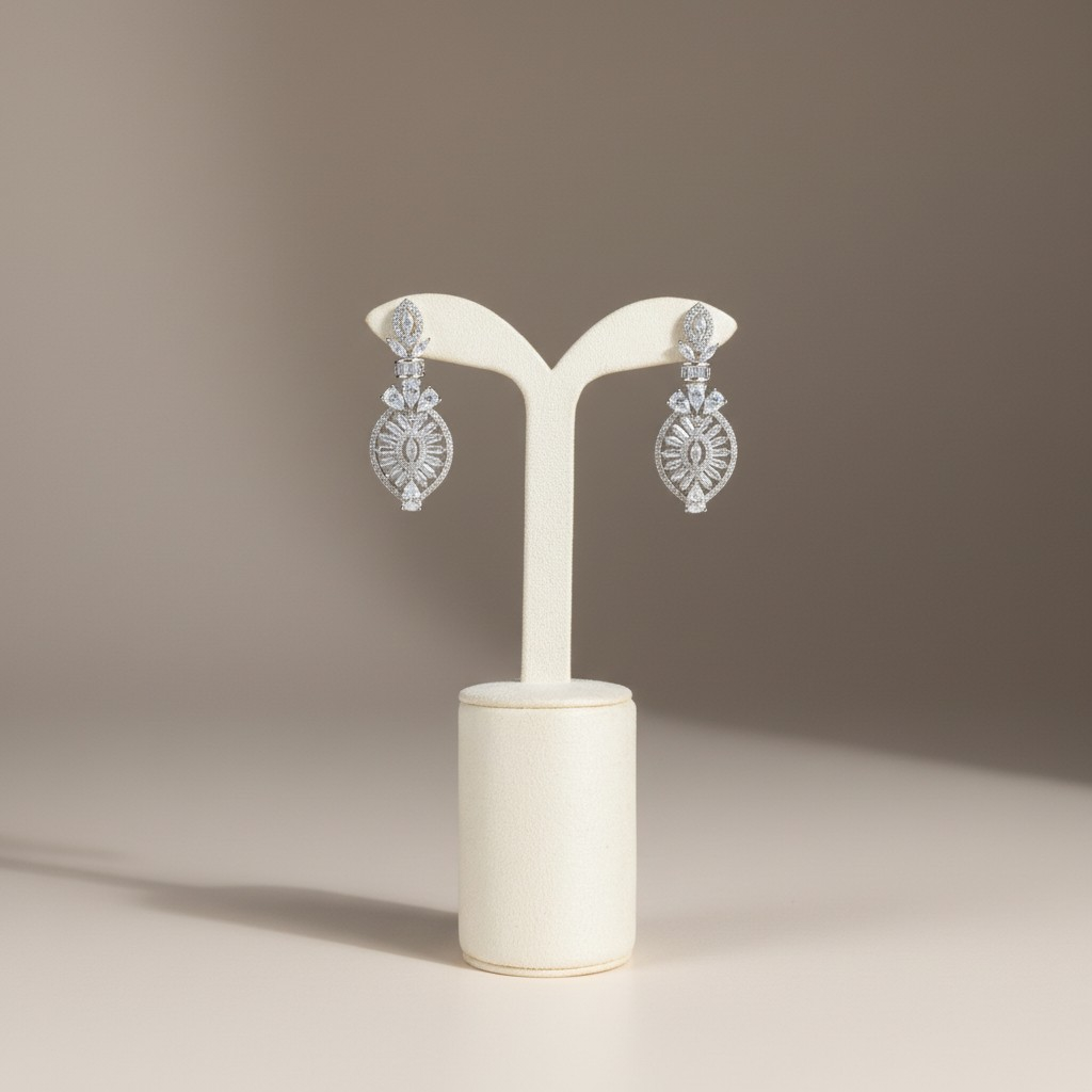 طقم فاخر مطلي ذهب أبيض مرصّع بأحجار زركون عالية اللمعان بتصميم كلاسيكي يعكس فخامة المجوهرات الراقية.