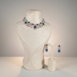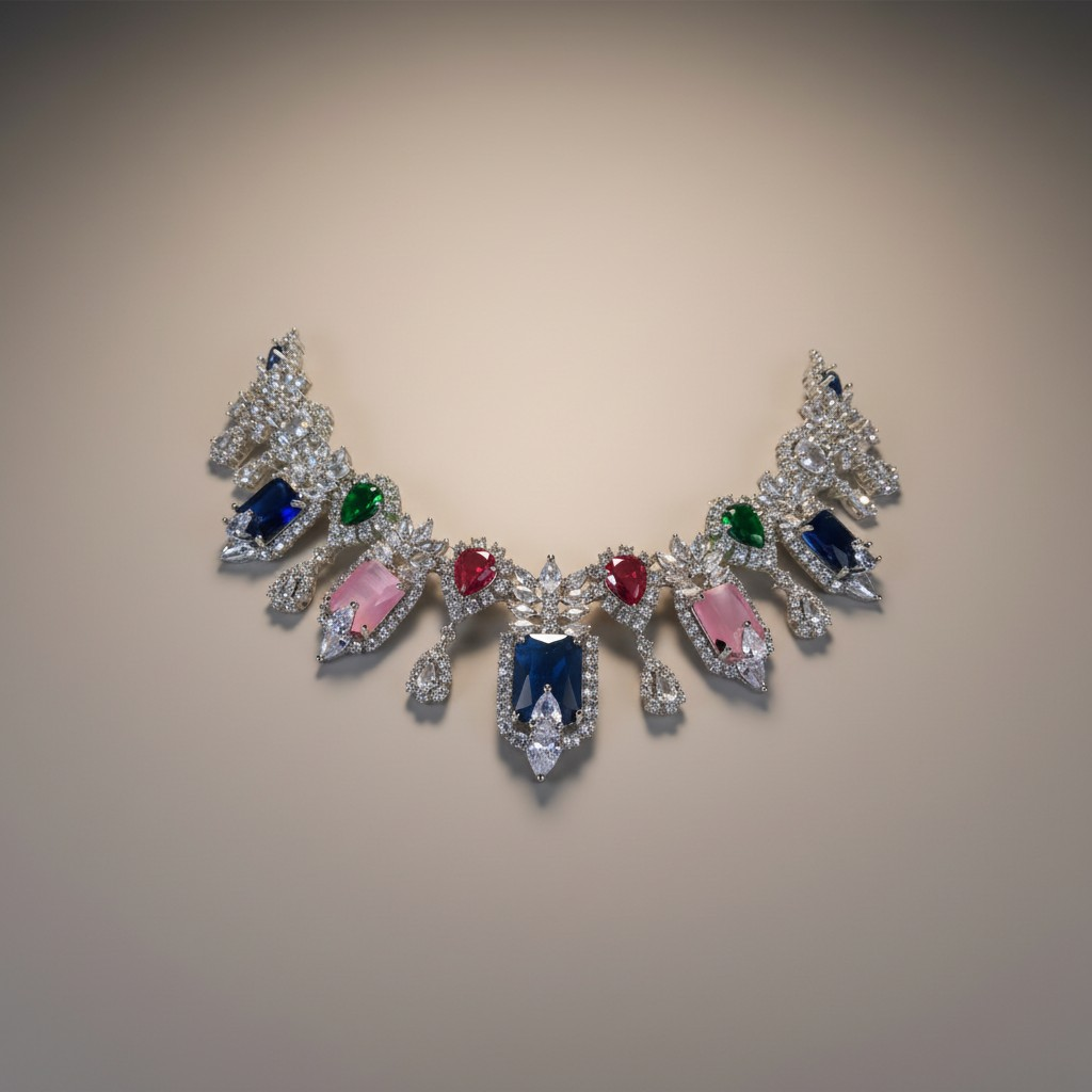 طقم فاخر مرصّع بأحجار زركون عالية الجودة بتدرجات لونية غنية تجمع بين الأزرق الملكي، الوردي الناعم، الأخضر العميق والأحمر الجريء، ضمن تصميم ملوكي متناغم مستوحى من التيجان الكلاسيكية.
