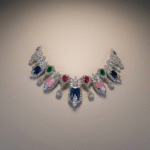 تتوسطه أحجار بارزة بإطار مرصّع بدقة عالية تعكس الضوء بحضور استثنائي، مما يجعله قطعة مثالية للمناسبات الكبرى والسهرات الراقية.