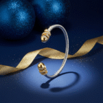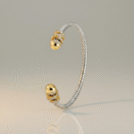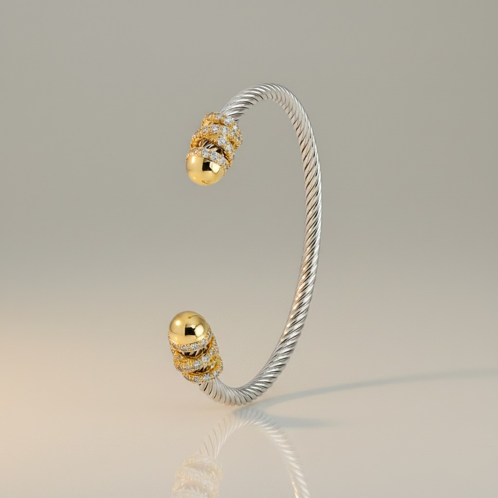 سوار مفتوح قطعة واحدة أنيقة وملفتة، حيث ينساب الشكل الملتف بسلاسة ليمنح المعصم حضورًا راقيًا، بينما تضيف الأطراف المزينة بتفاصيل مرصعة لمسة فخمة تبرز جمال التصميم من أول نظرة.