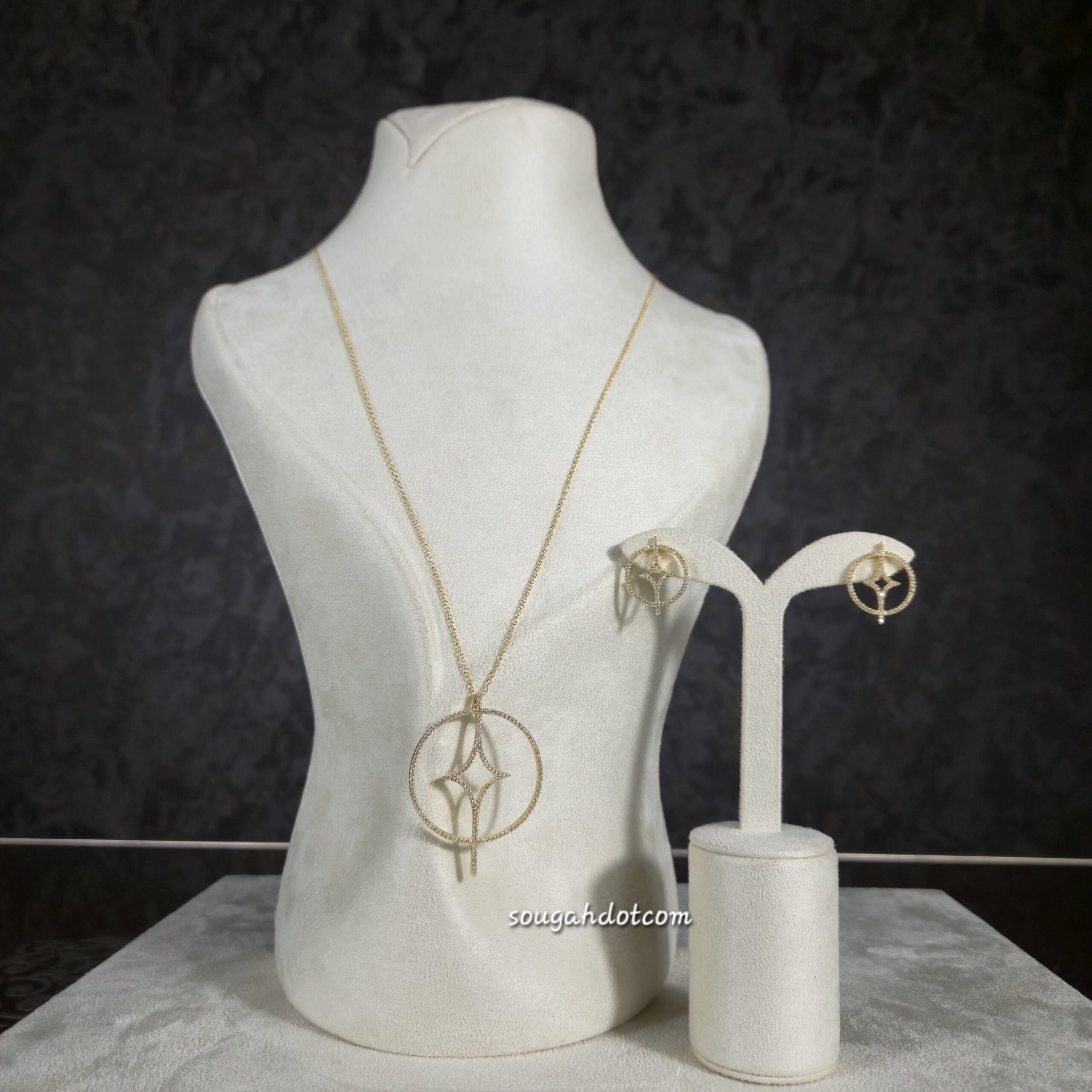 طقم مطلي ذهب بتصميم هندسي عصري يجمع بين الخطوط الناعمة والدائرة المتألقة، مرصّع بأحجار زركون دقيقة تضيف بريقًا راقيًا بدون مبالغة. يتكوّن من عقد وأقراط متناسقة، مثالي للإطلالات اليومية الأنيقة أو للمناسبات البسيطة. مقاوم لتغيّر اللون ومناسب للبشرة الحساسة.