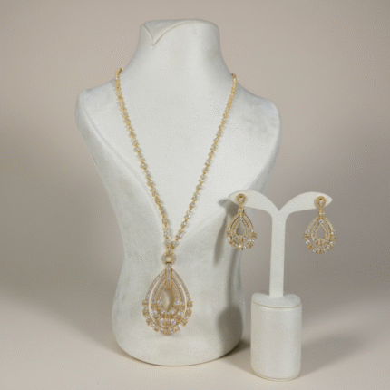 طقم مطلي ذهب بتصميم هندسي عصري يجمع بين الخطوط الناعمة والدائرة المتألقة، مرصّع بأحجار زركون دقيقة تضيف بريقًا راقيًا بدون مبالغة. يتكوّن من عقد وأقراط متناسقة، مثالي للإطلالات اليومية الأنيقة أو للمناسبات البسيطة. مقاوم لتغيّر اللون ومناسب للبشرة الحساسة.