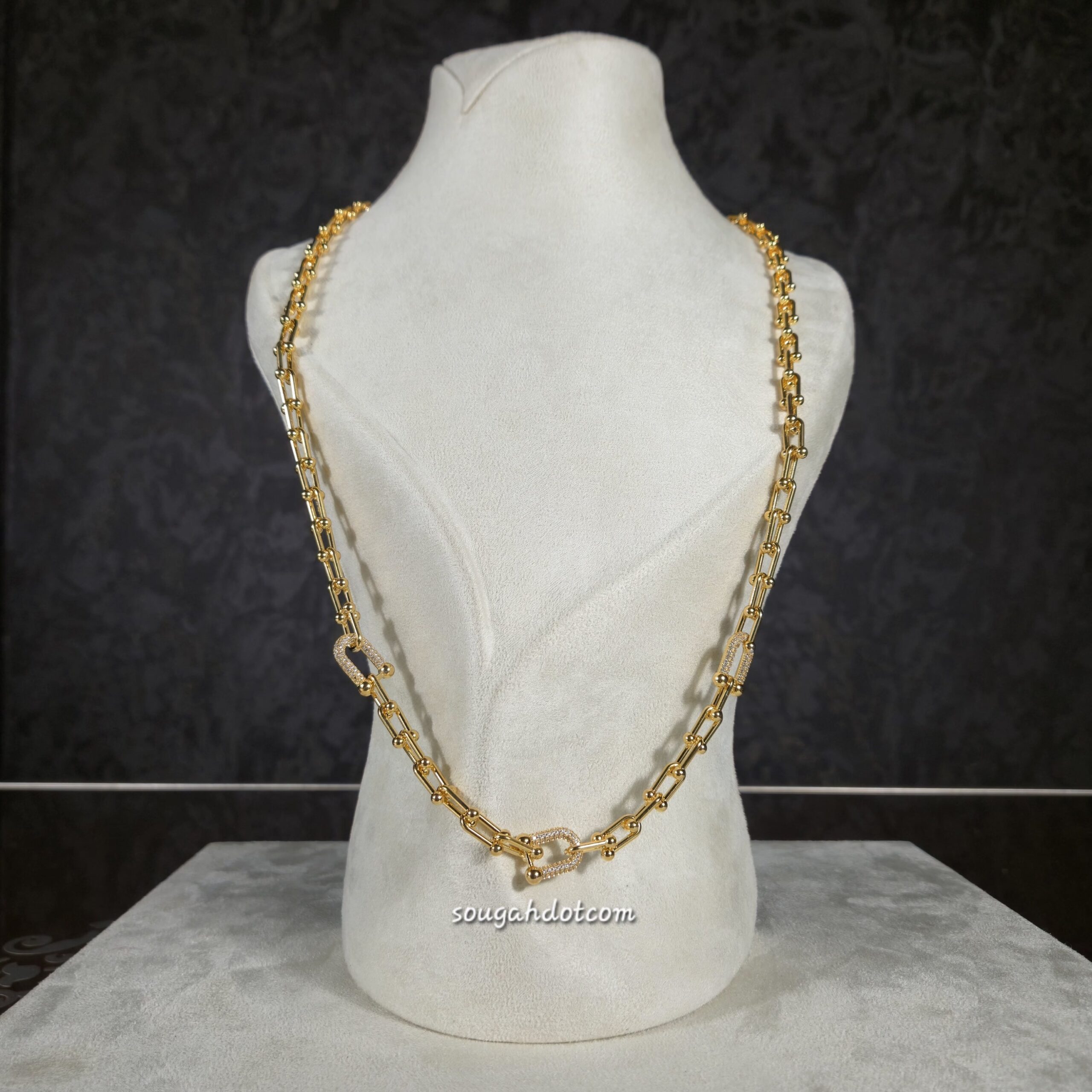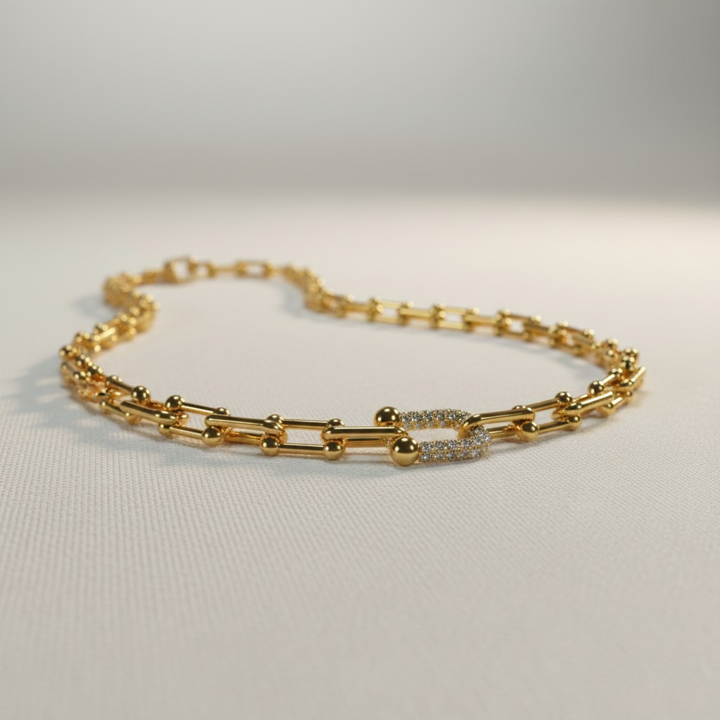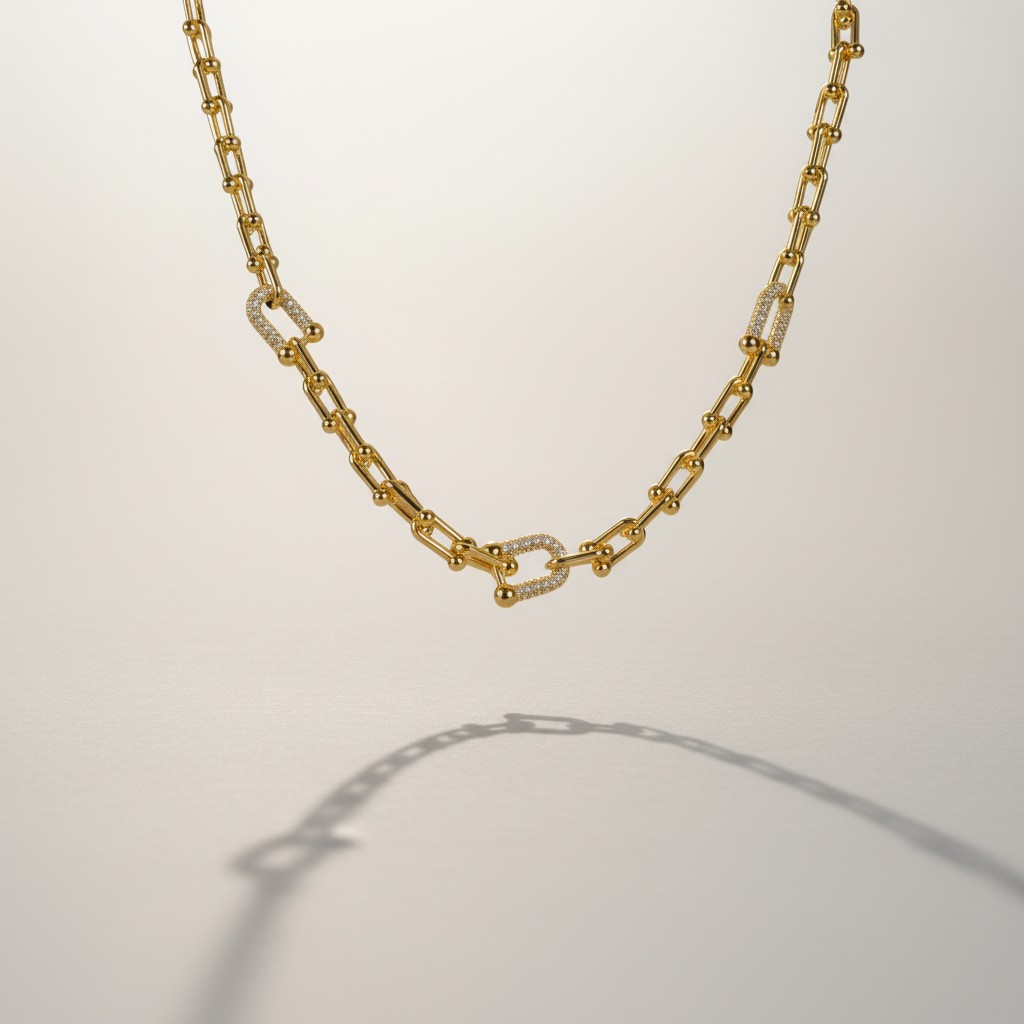 قلادة فاخرة مطلية ذهب بجودة عالية، بتصميم سلسلة عصري تتخلله كرات ذهبية ناعمة ولمسة قفل مرصّع بالزركون يمنحها بريقًا يشبه الألماس. قطعة راقية تجمع بين الجرأة والأناقة، مثالية لإطلالات المساء والمناسبات الخاصة، وتضفي حضورًا أنثويًا لافتًا مع كل ارتداء