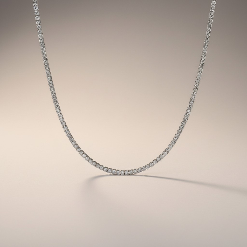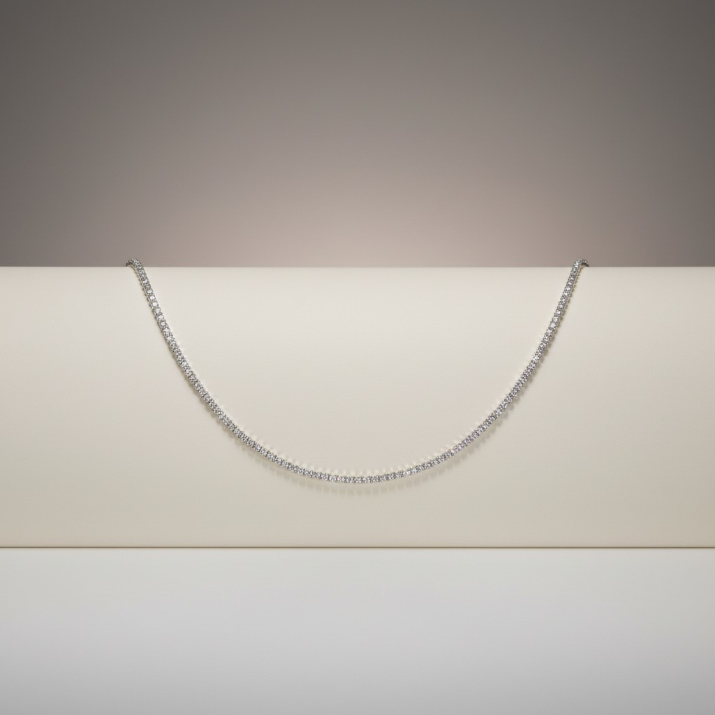 عقد مطلي بلاتين بتصميم كلاسيكي مرصّع بالكامل بأحجار الزركون اللامعة، يمنح الرقبة بريقًا ناعمًا ومتوازنًا يناسب جميع الإطلالات. قطعة أساسية لا تخرج من الموضة، مثالية للارتداء اليومي أو للمناسبات، مقاومة لتغيّر اللون ومناسبة للبشرة الحساسة.