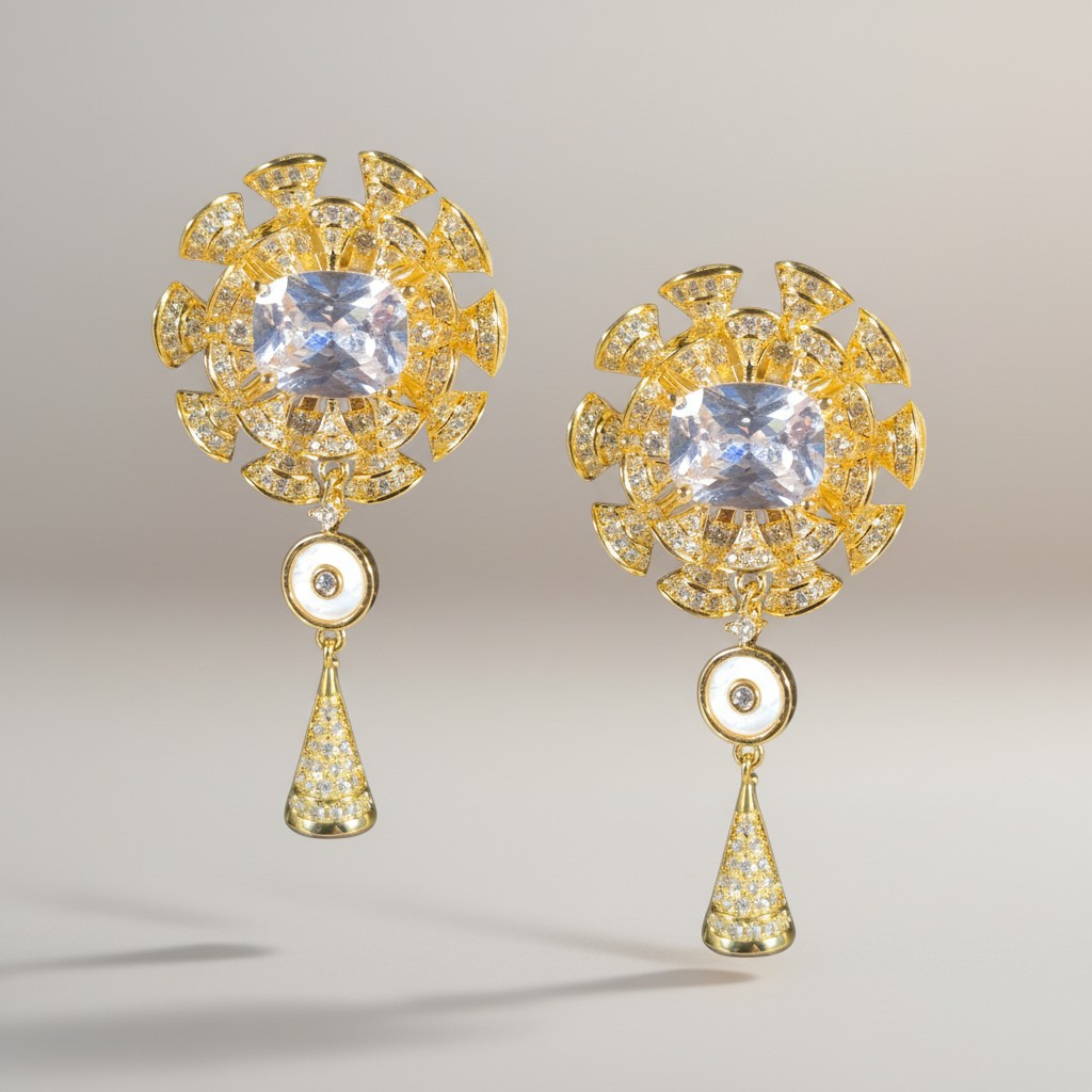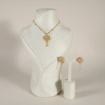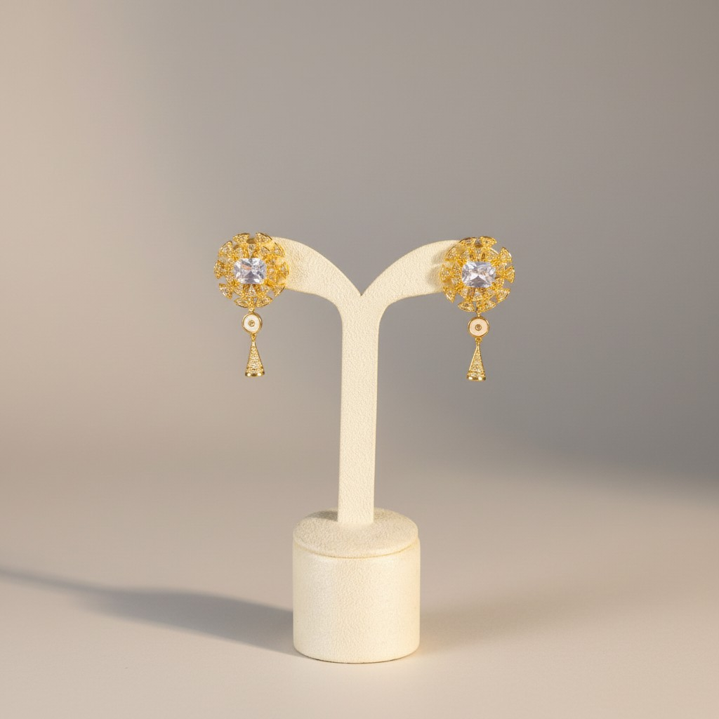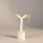 تأتي الأقراط بتصميم متناسق مستوحى من نفس الزهرة المرصعة، مع تعليقة صغيرة متدلية تعكس أناقة التصميم وتكمل الطقم بتناغم فاخر مناسب للمناسبات والسهرات الراقية.