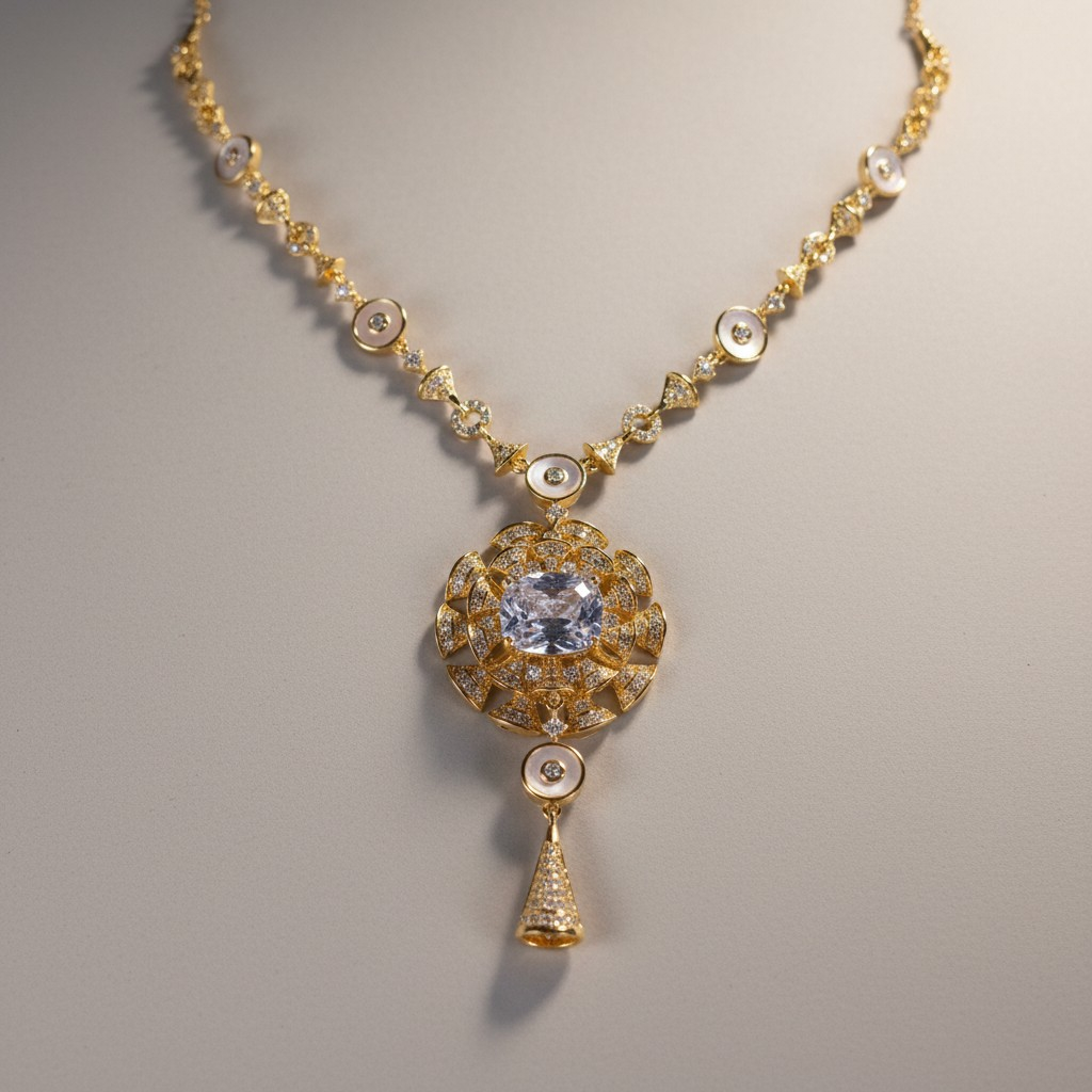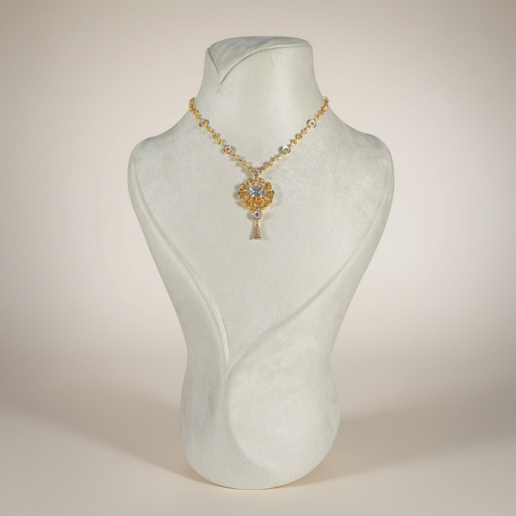يتوسط العقد عنصر دائري فاخر بتصميم يشبه زهرة متفتحة مرصّعة بأحجار لامعة، تتوسطها حجر زركون لامع يمنح القطعة لمسة لون أنيقة تضيف عمقاً وجاذبية للتصميم. تتدلى من التعليقة قطعة صغيرة متحركة تضيف حركة خفيفة تعزز من جمال القطعة وأناقتها.