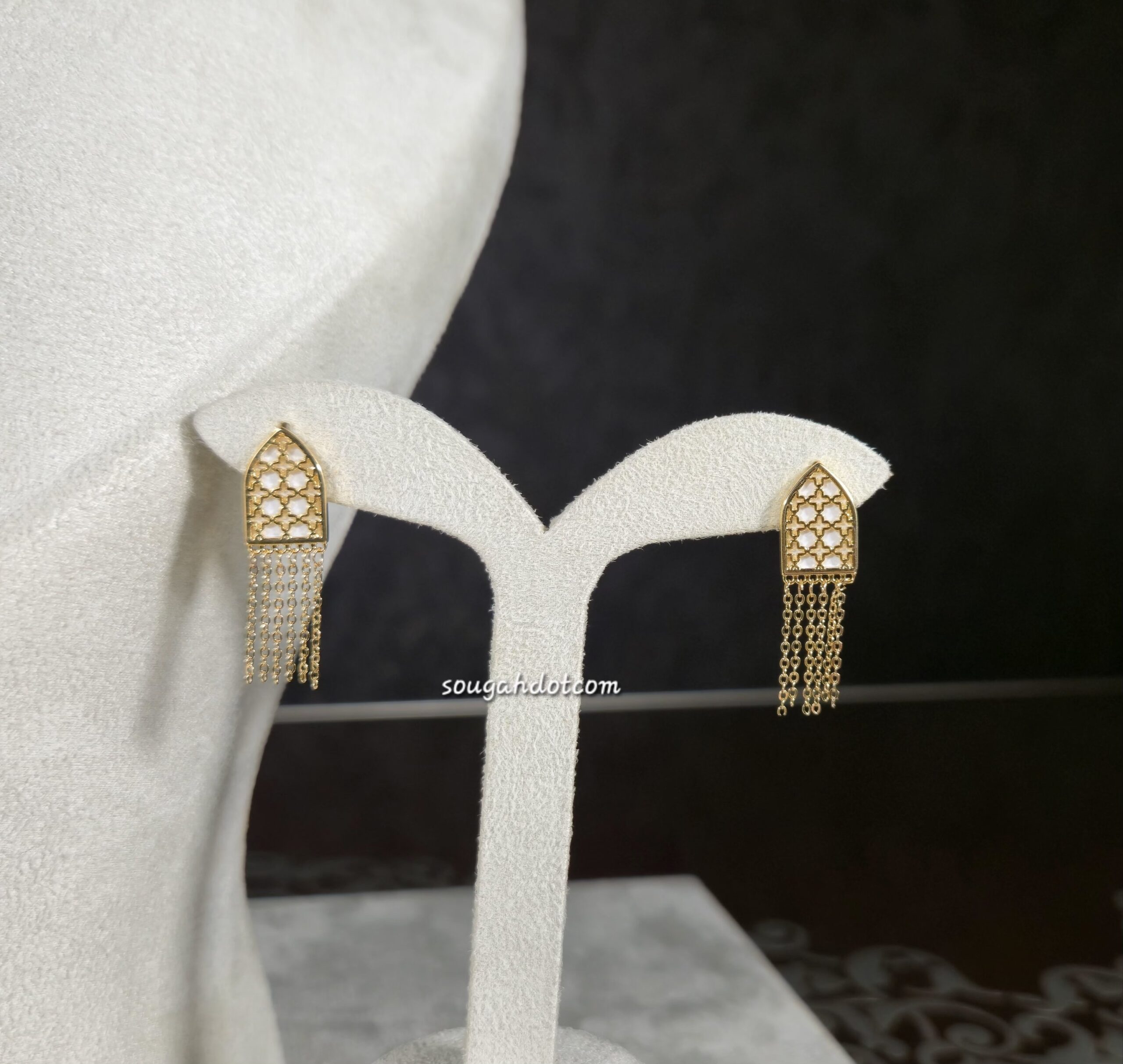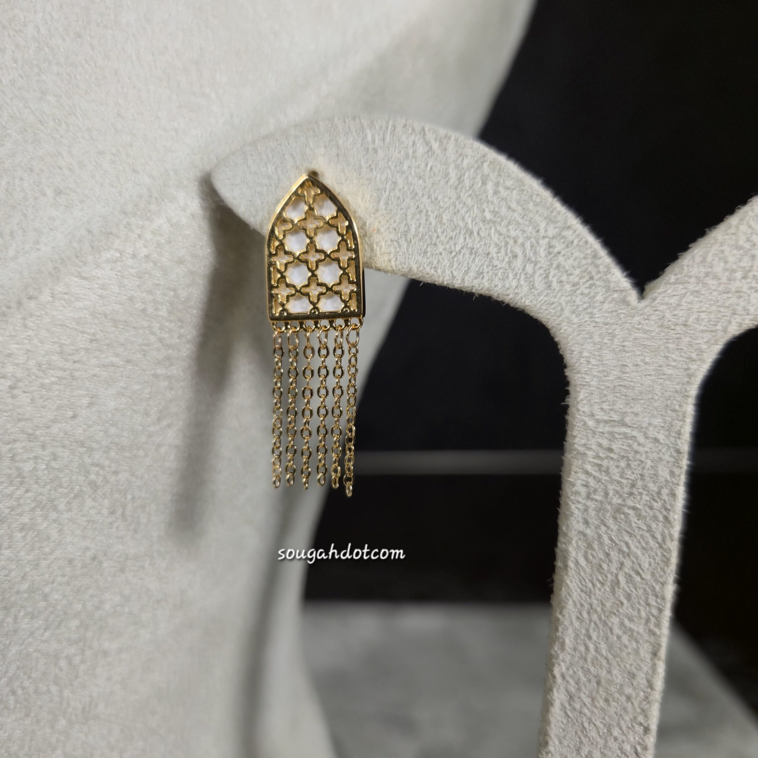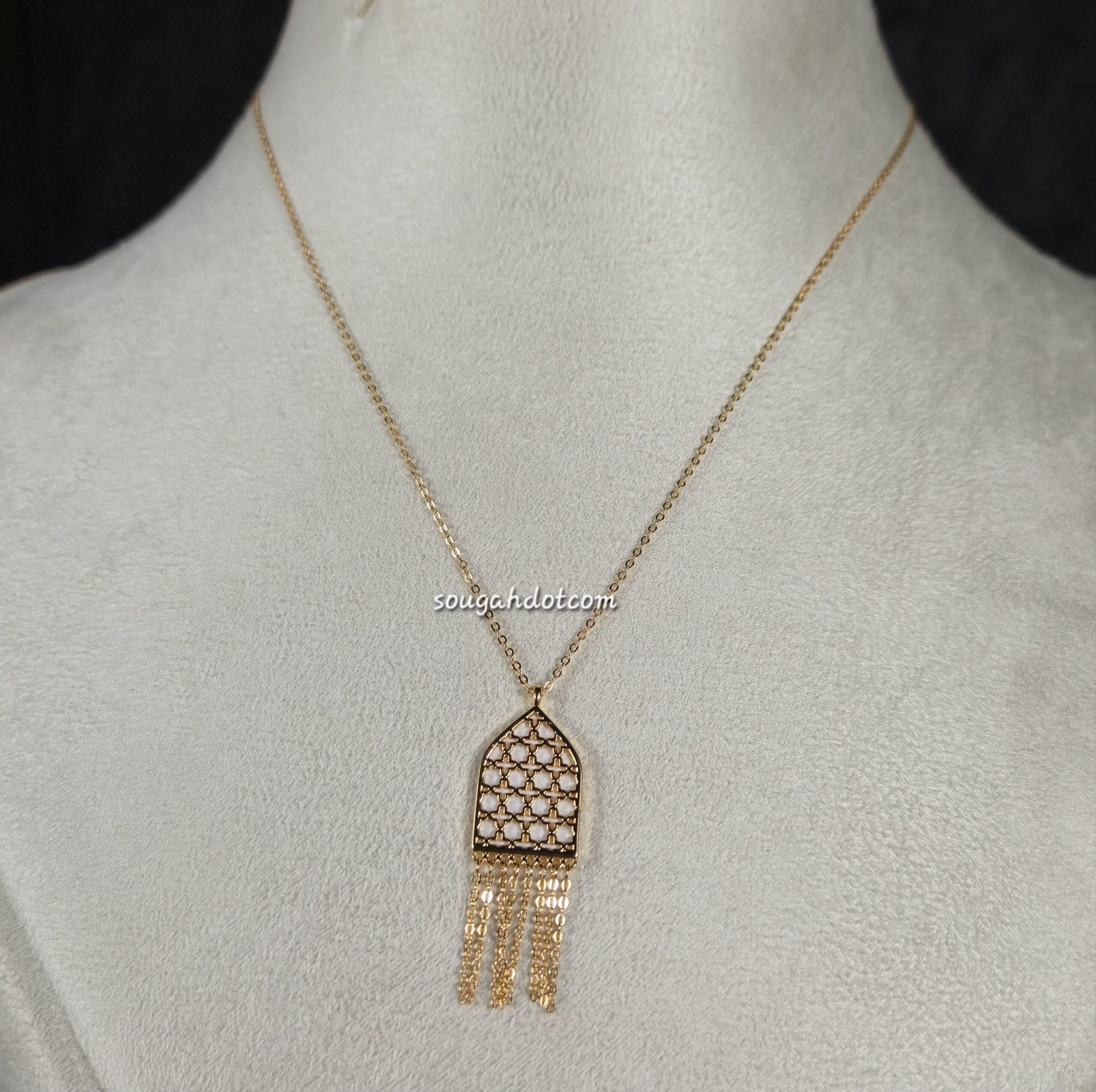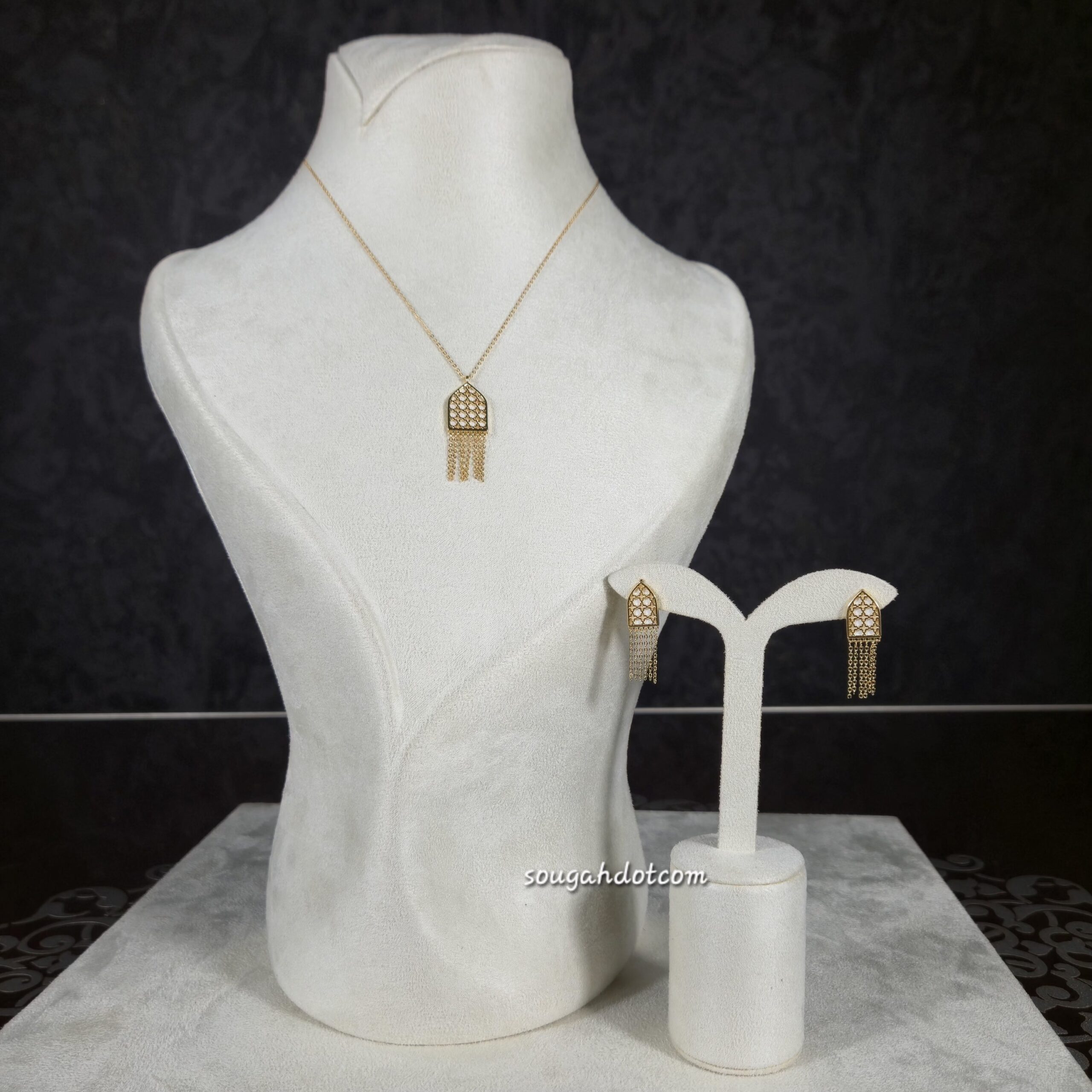 طقم مطلي ذهب بتصميم رقيق يضم عقدًا بتعليقة صغيرة مرصّعة بالزركون تتدلّى منها سلاسل ذهبية ناعمة، مع أقراط متناسقة تضيف حركة أنثوية جذابة. قطعة خفيفة على العنق، سهلة التنسيق، ومثالية للإطلالات اليومية أو المناسبات الهادئة. مقاوم لتغيّر اللون ومناسب للبشرة الحساسة، ليمنحك لمسة أناقة ناعمة تدوم.