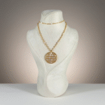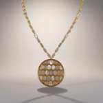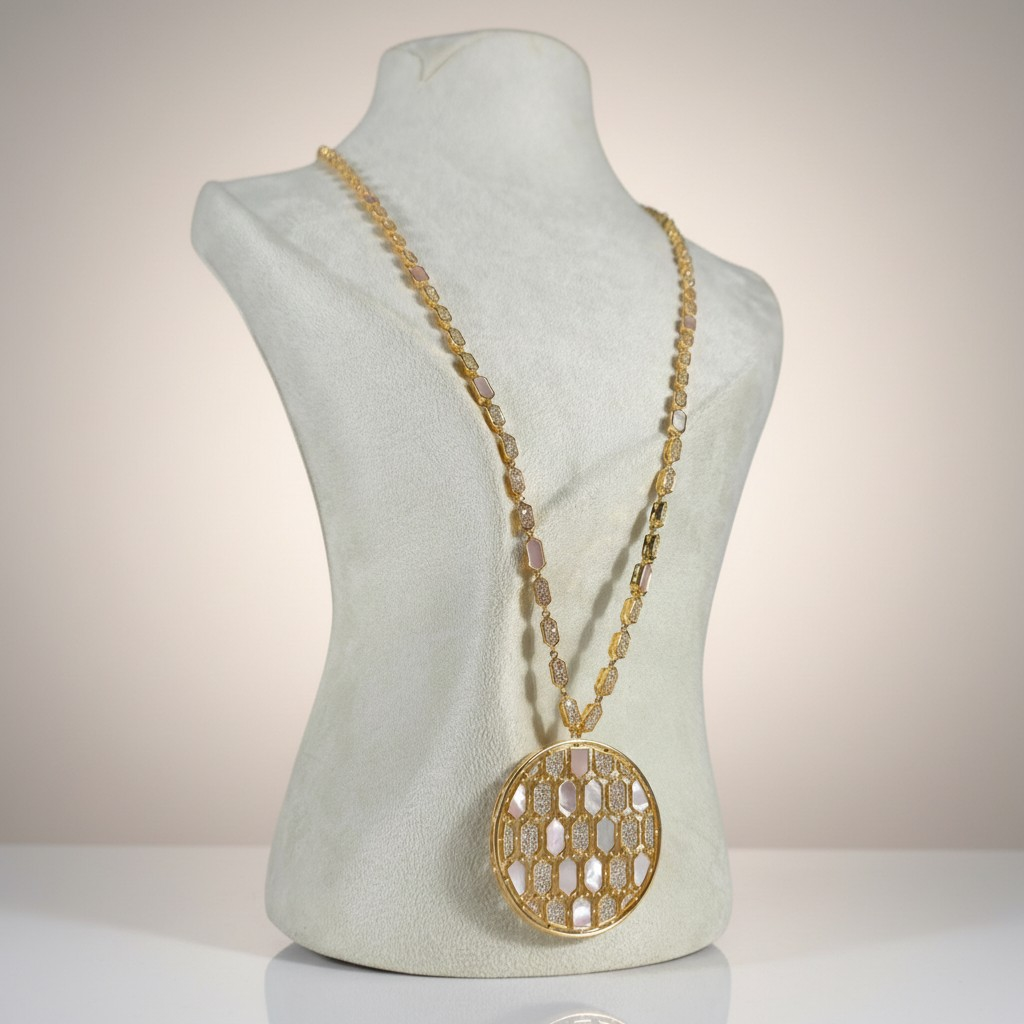 ينتهي العقد بتعليقة دائرية كبيرة بتصميم هندسي مستوحى من نمط خلية العسل، تتداخل فيها الأحجار اللامعة مع قطع لؤلؤية فاتحة لتخلق تبايناً فاخراً بين البريق والنعومة.