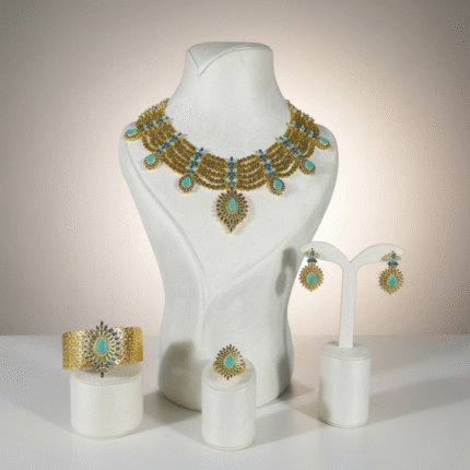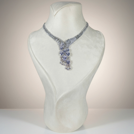 السطح المرصّع بالكامل يعكس الضوء ببريق متوازن، بينما يمنح التصميم المتدلي حركة أنثوية أنيقة تضيف حضوراً عصرياً راقياً.