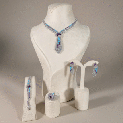 طقم فضي مرصّع بأحجار زركون عالية الجودة بتصميم حلقتين مترابطتين يرمز للانسجام والقوة في آنٍ واحد.