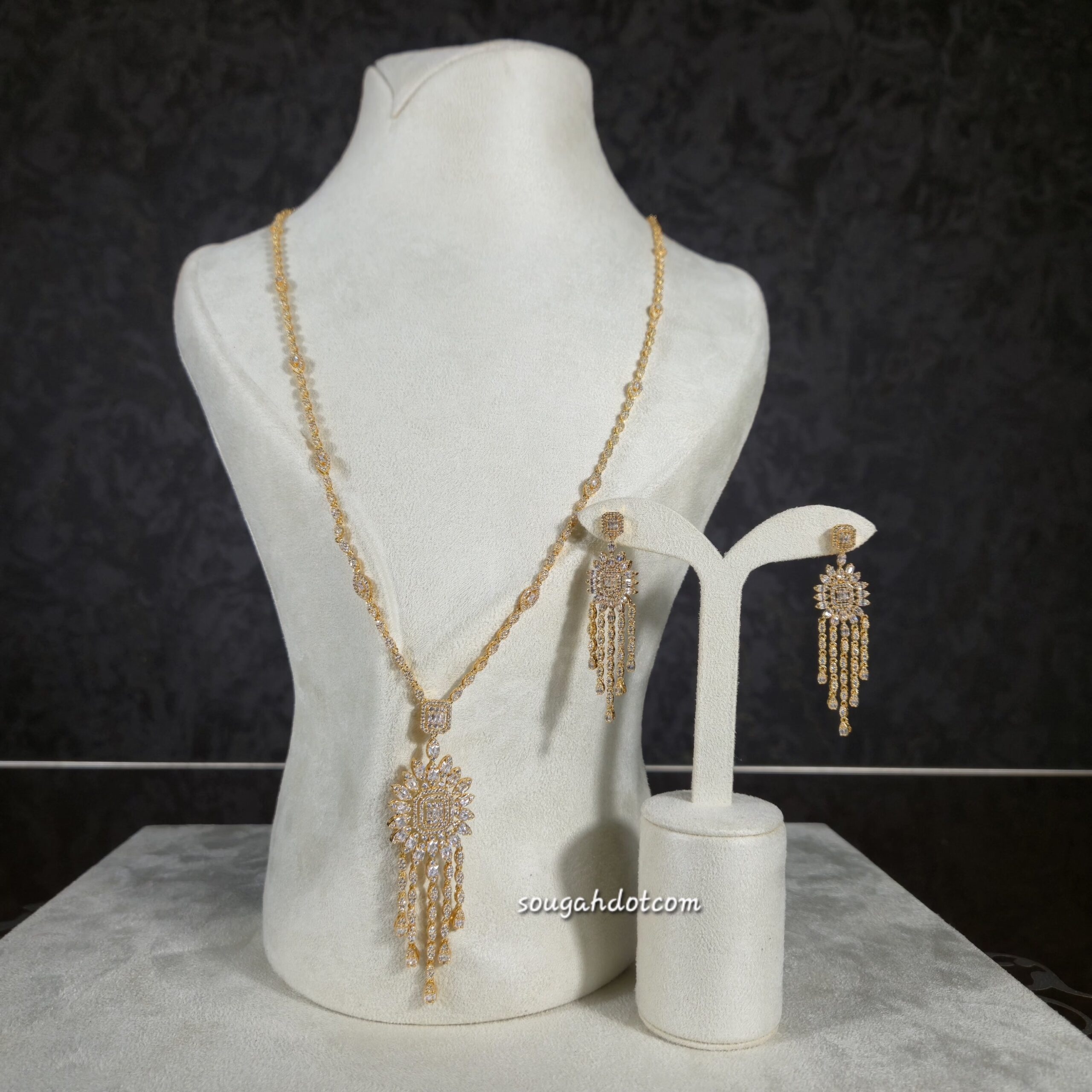 طقم فاخر مطلي ذهب بجودة عالية، مرصّع بحجر الزركون بتصميم هندسي أنيق ولمعة تحاكي بريق الألماس. العقد يتوسطه تعليقة متدلّية بانسيابية راقية، مع أقراط متناسقة تضيف حضورًا ملكيًا لكل إطلالة. قطعة مميزة تجمع بين الرقي والجرأة، مثالية للسهرات والمناسبات الخاصة.
