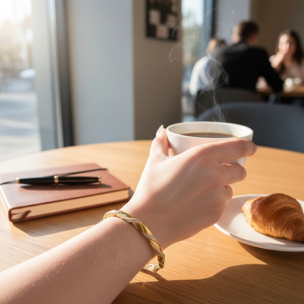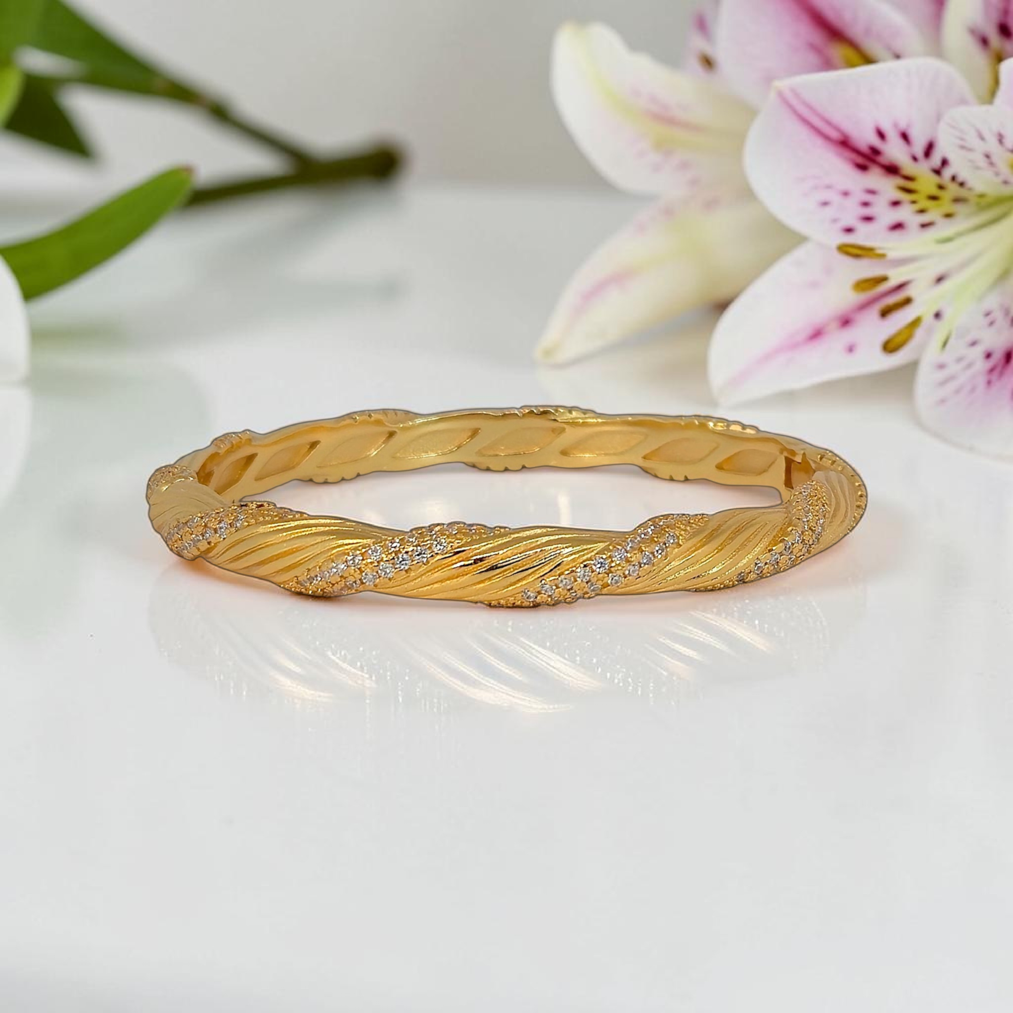 تتداخل فيه التموجات الذهبية مع لمسات مرصعة دقيقة بأحجار الزركون العالية الجودة، لتمنح القطعة إحساسًا بالحركة والرقي في آنٍ واحد.