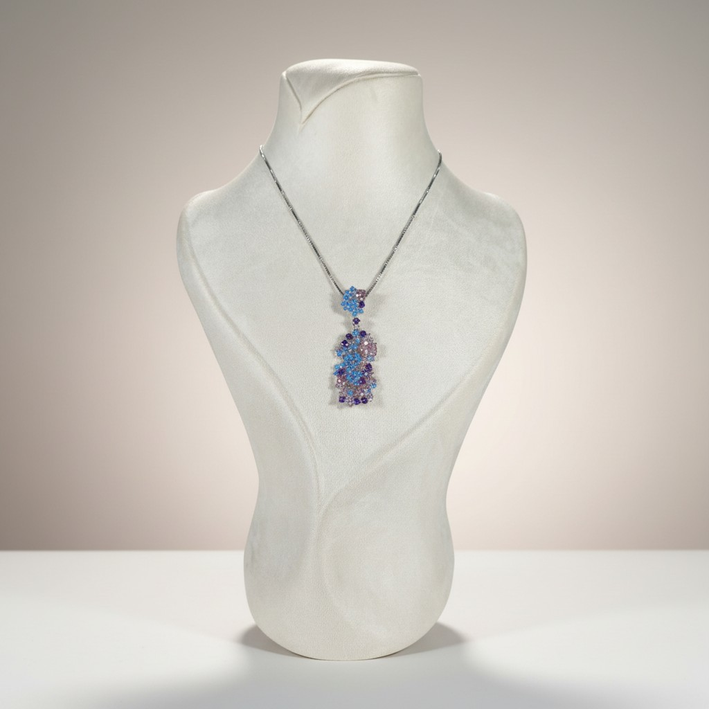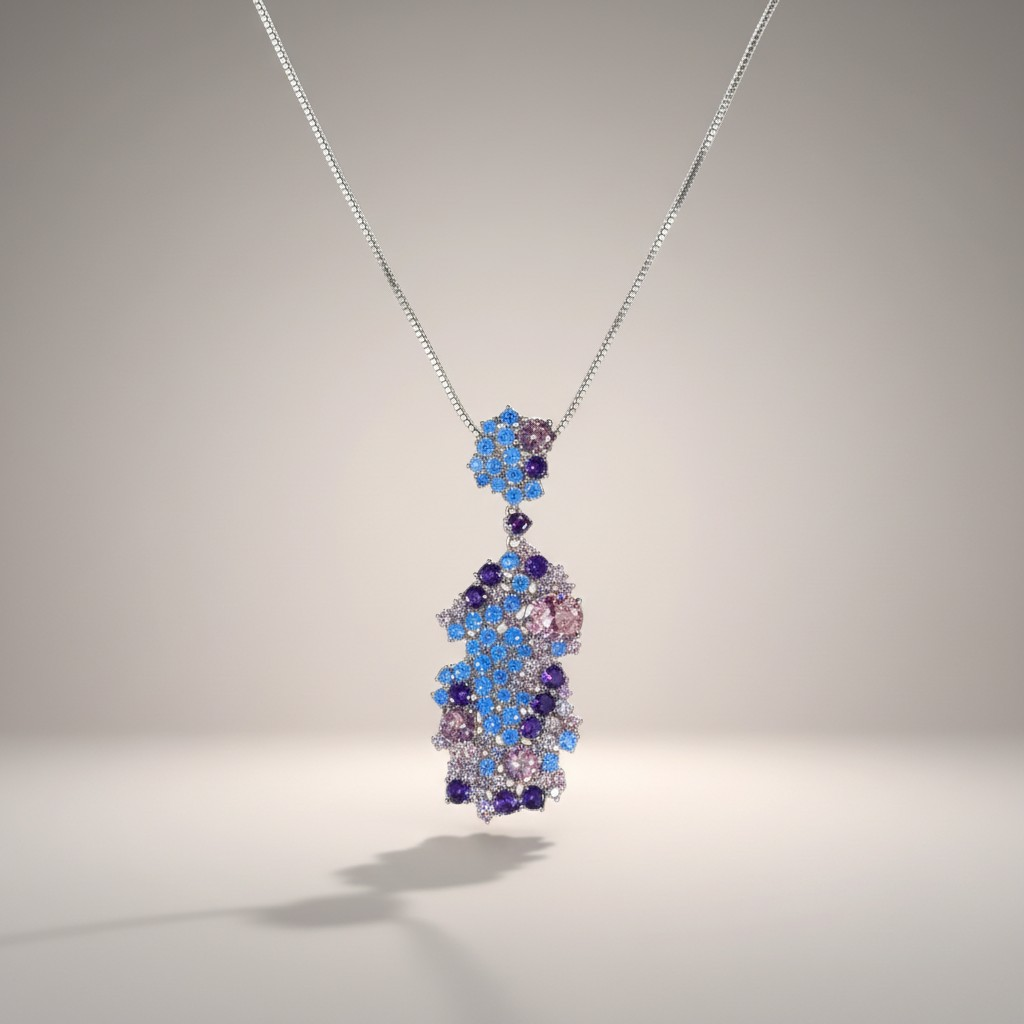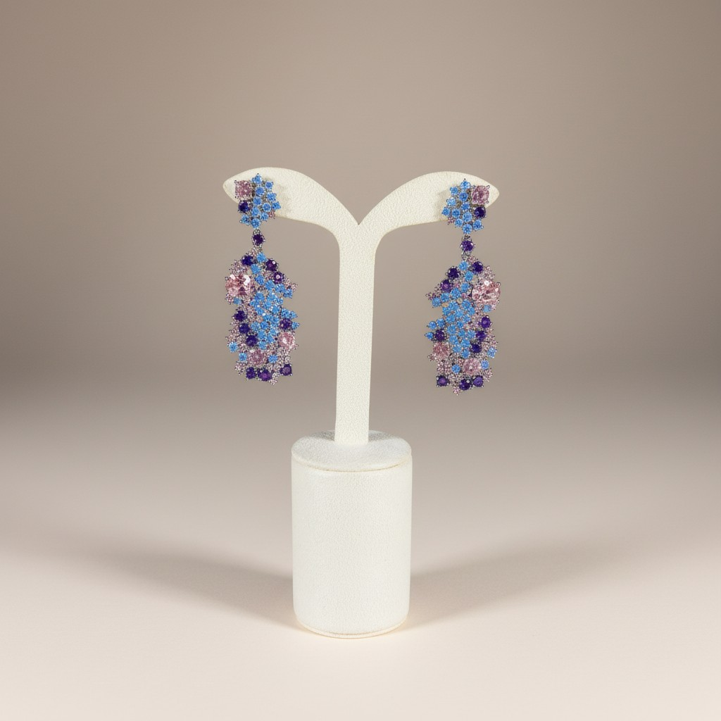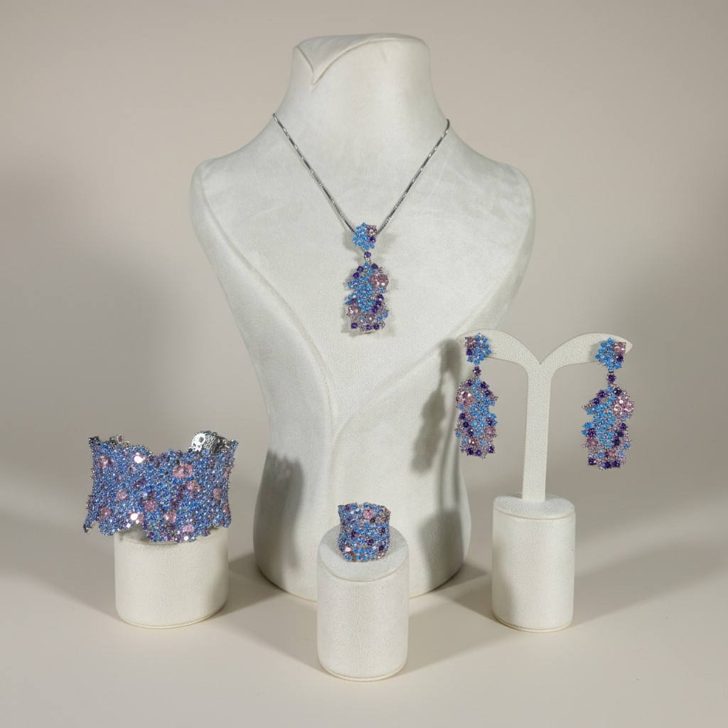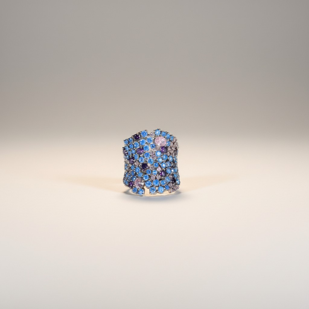 طقم فاخر مطلي ذهب أبيض مرصّع بكثافة بأحجار الزركون اللامعة بتدرجات ساحرة من الأزرق والبنفسجي والوردي، ليمنح القطعة بريقاً يشبه ألوان الشفق في السماء.