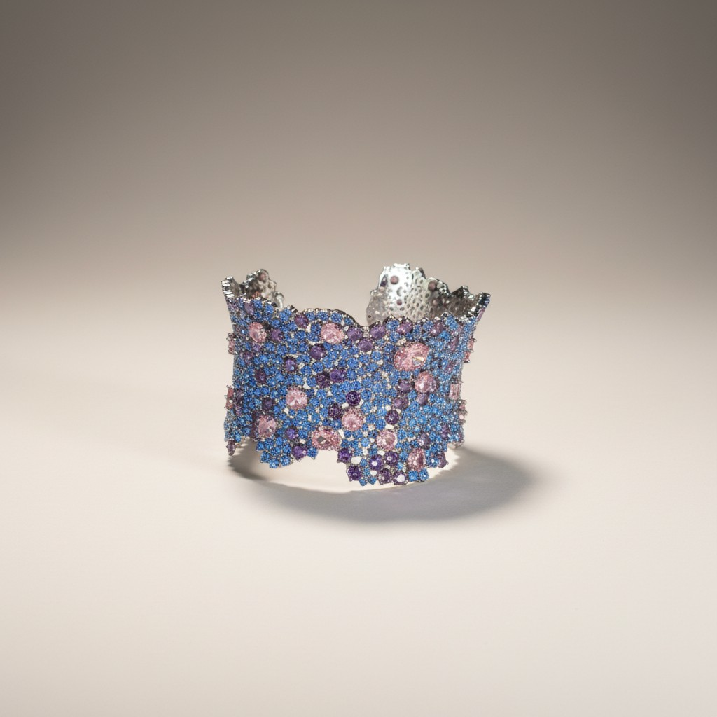 يتميّز التصميم بتفاصيل مرصوفة بدقة عالية تمنح كل قطعة عمقاً بصرياً لافتاً وحضوراً استثنائياً، حيث تتناغم الأحجار متعددة الألوان لتشكّل لوحة فاخرة من الضوء واللمعان.