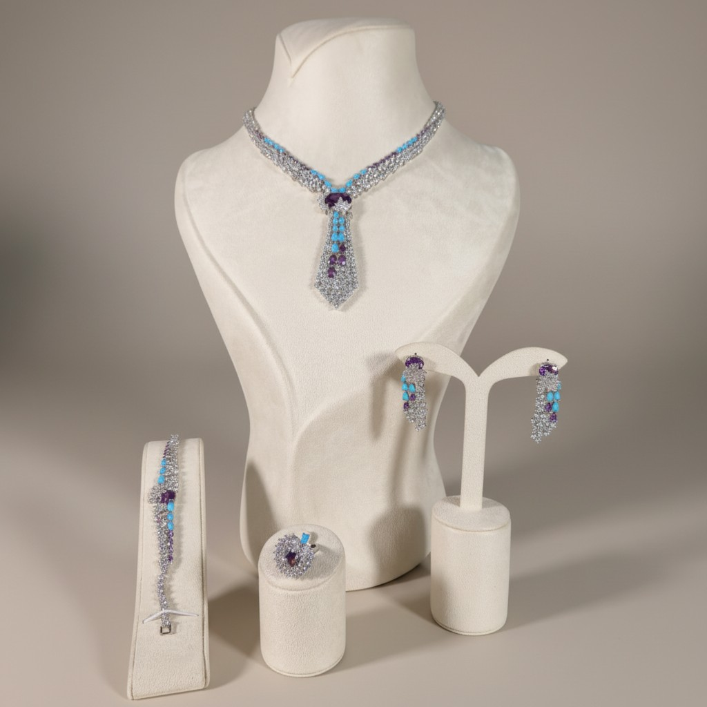 يتكوّن الطقم من أربع قطع متكاملة: عقد بتصميم مهيب ينتهي بتعليقة متدلية بارزة، أقراط بانسيابية راقية، سوار فاخر، وخاتم يعكس قوة الهوية التصميمية.