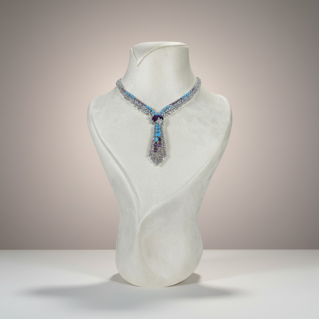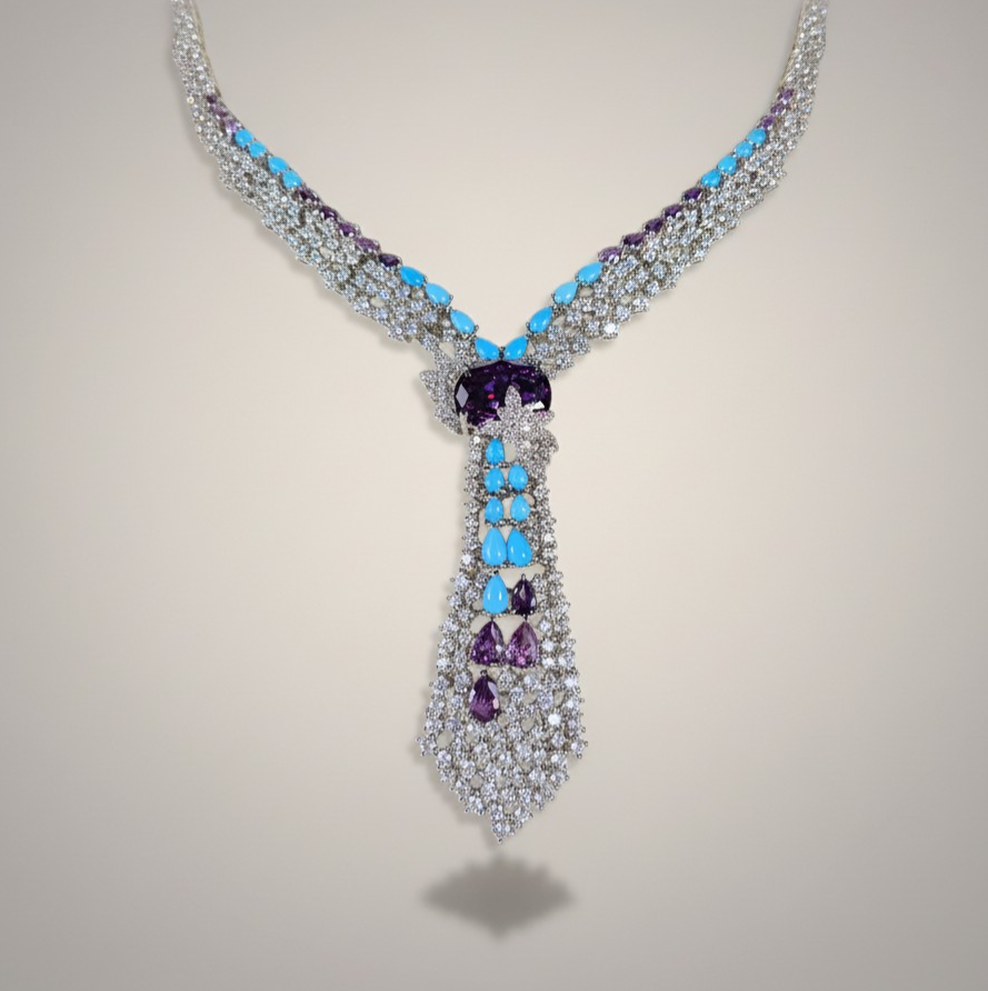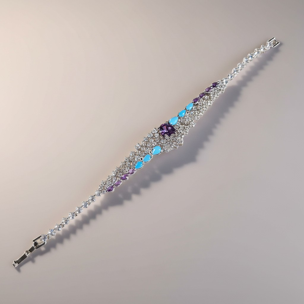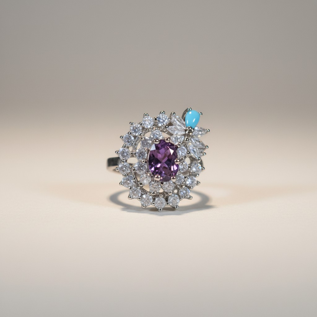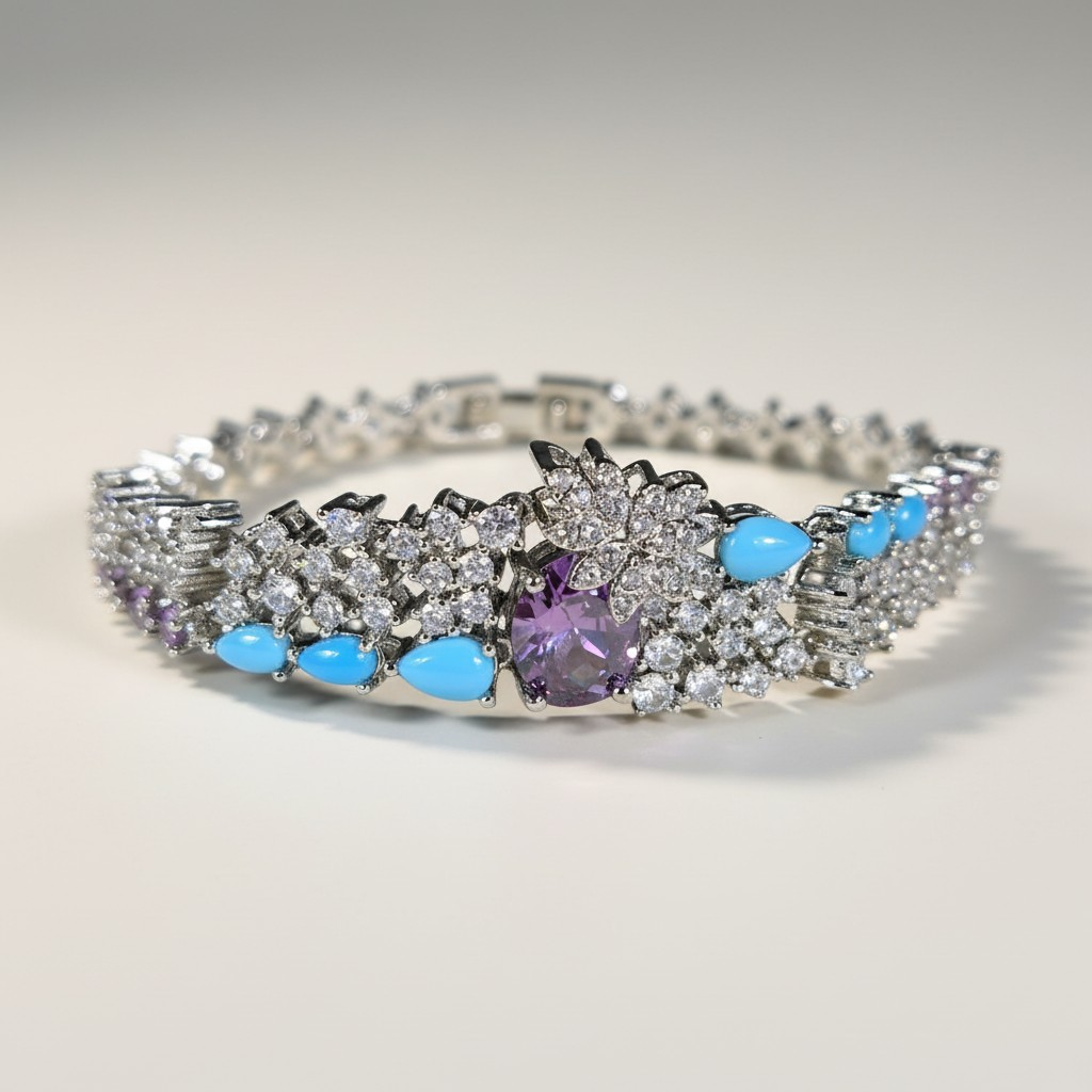 يتألق بأحجار زركون فاخرة بتدرجات تركواز عميقة تتناغم مع لمسات بنفسجية غنية، محاطة بإطار مرصوف بدقة عالية يعكس براعة التفاصيل ورفاهية الحضور.