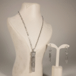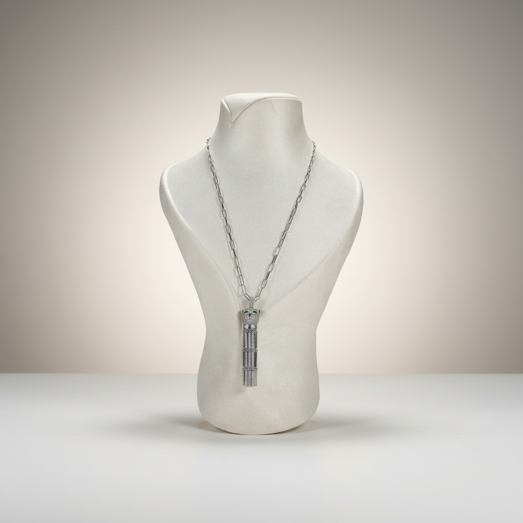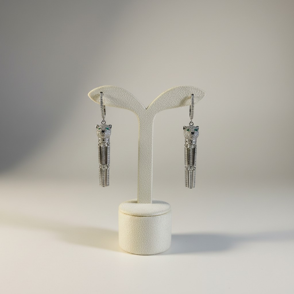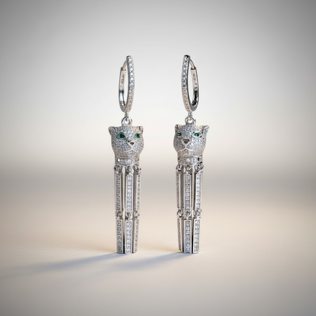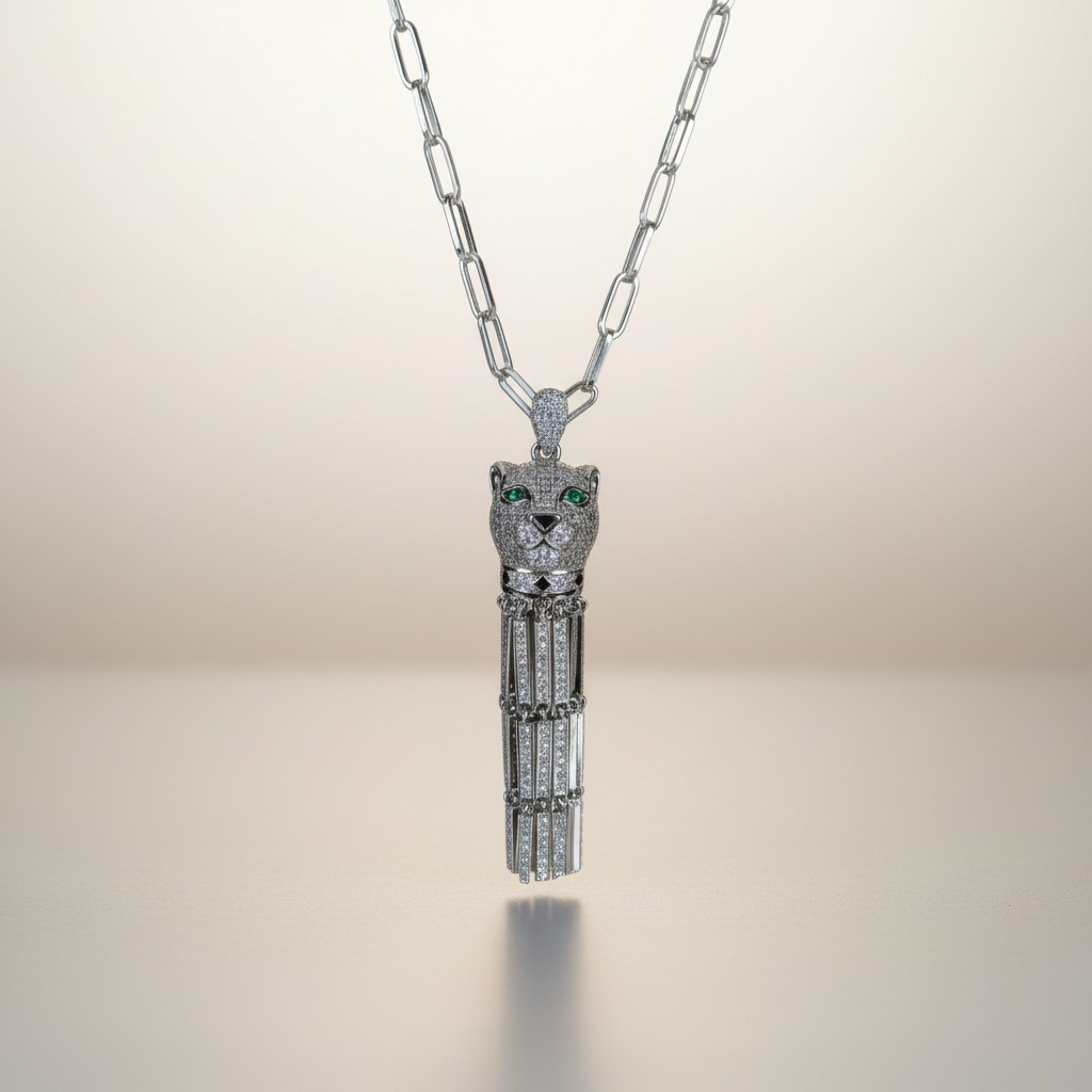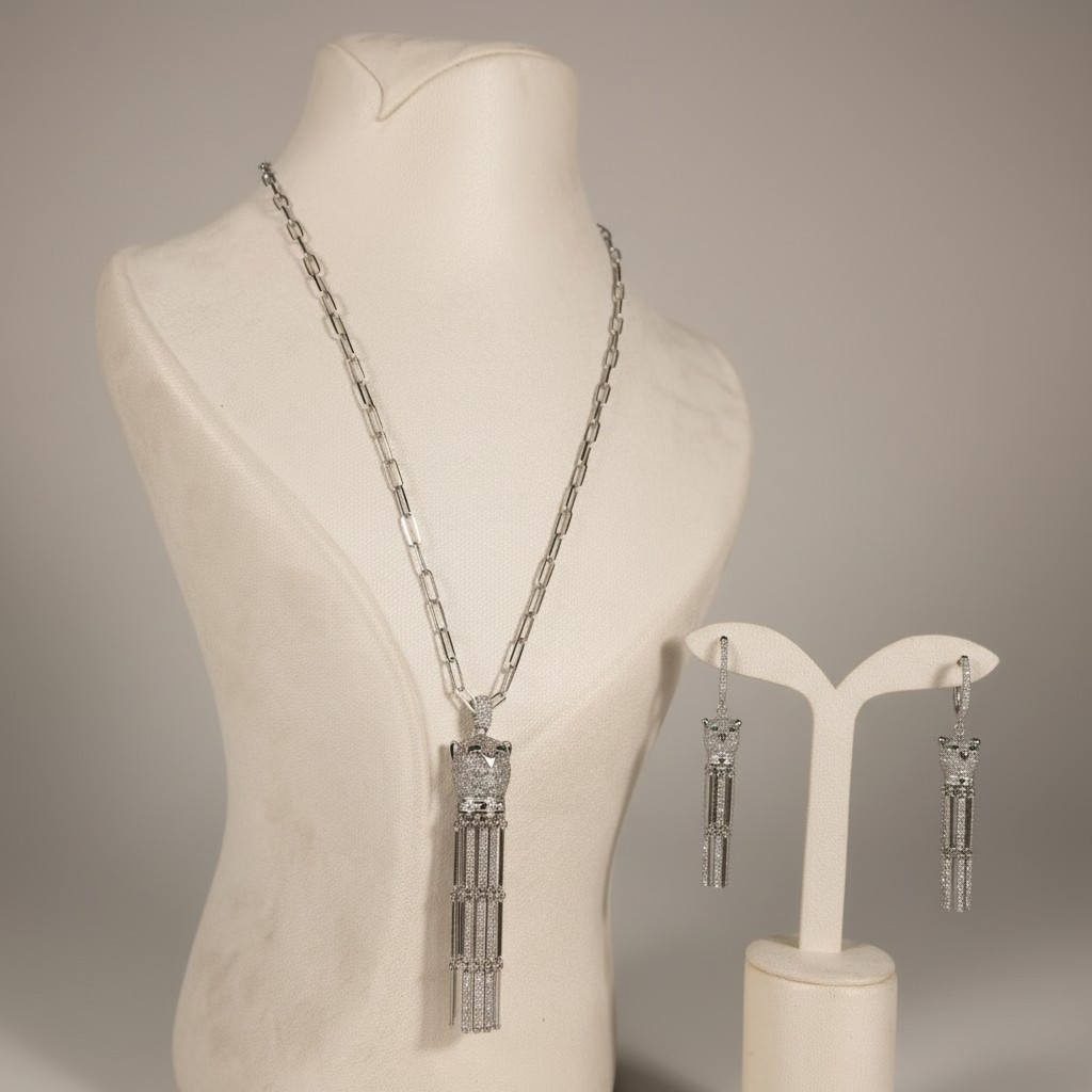 طقم مطلي بلاتين بتصميم جريء مستوحى من قوة الفهد، يتكوّن من عقد بسلسلة عصرية وتعليقة مرصّعة بالزركون مع لمسة عيون خضراء تضيف عمقًا وجاذبية فريدة، مع أقراط متناسقة تمنح الإطلالة حضورًا قويًا ولافتًا. قطعة مثالية للمرأة الواثقة التي تحب التميز، مقاومة لتغيّر اللون ومناسبة للبشرة الحساسة.