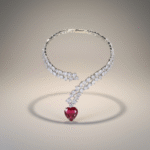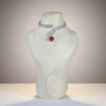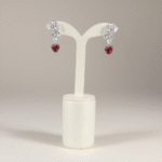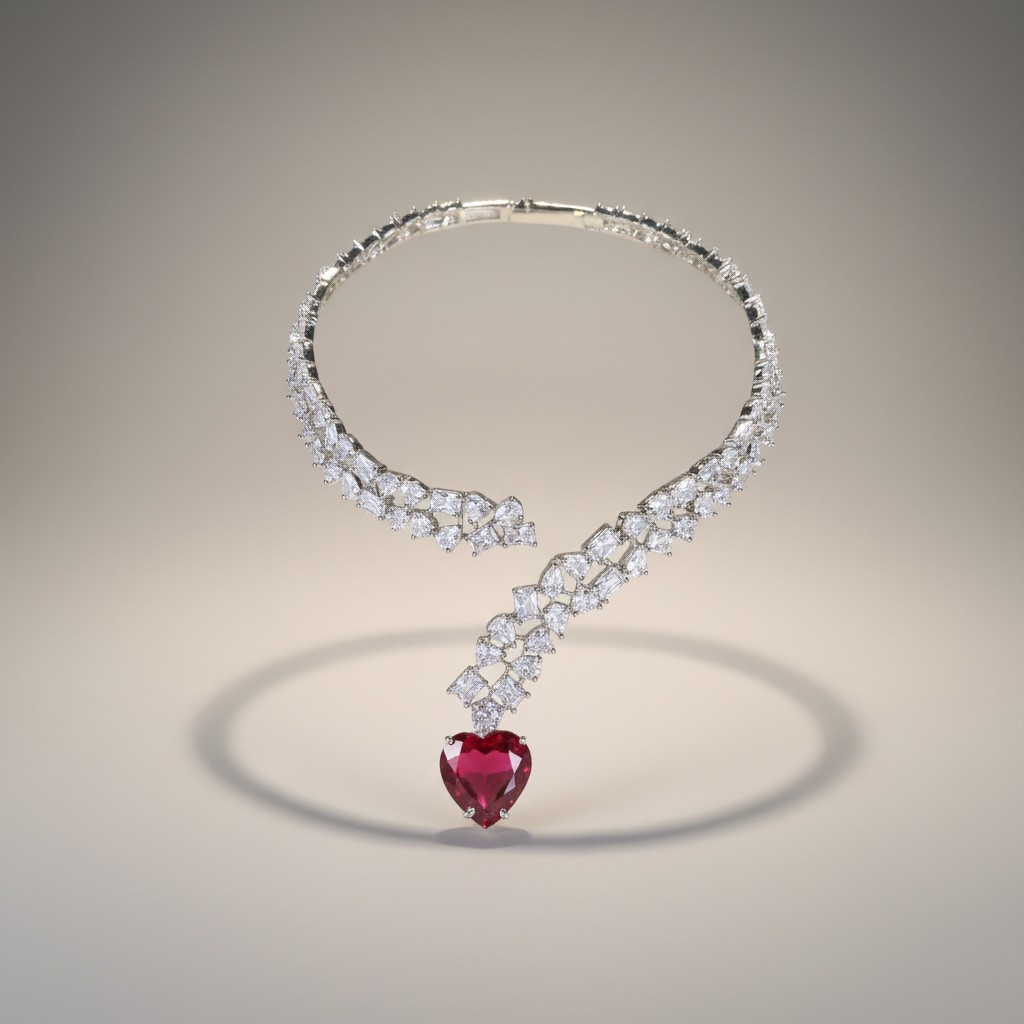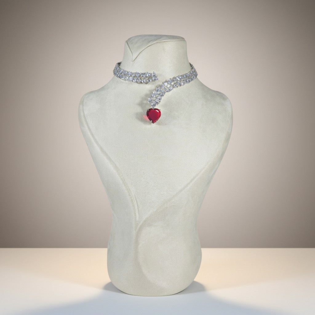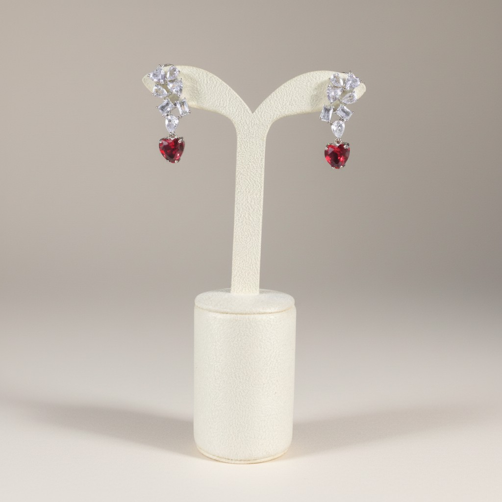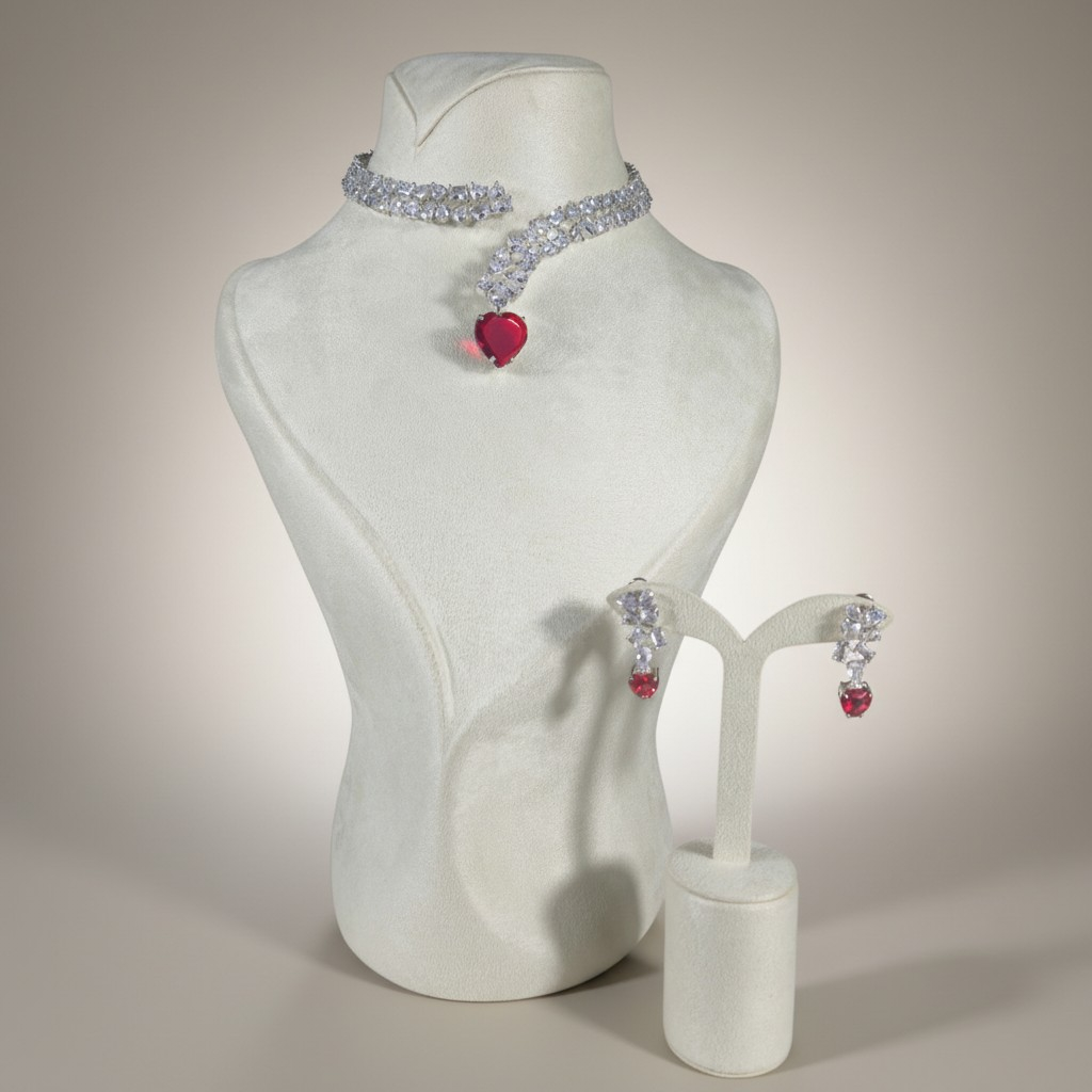 تتوسط العقد تعليقة على شكل قلب بلون أحمر عميق يمنح القطعة حضوراً رومانسياً لافتاً، بينما تأتي الأقراط المتناسقة بتفاصيل متدلية تنتهي بنفس الحجر الأحمر لتكمل الانسجام بين القطعتين.