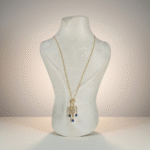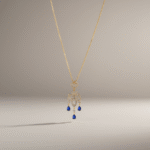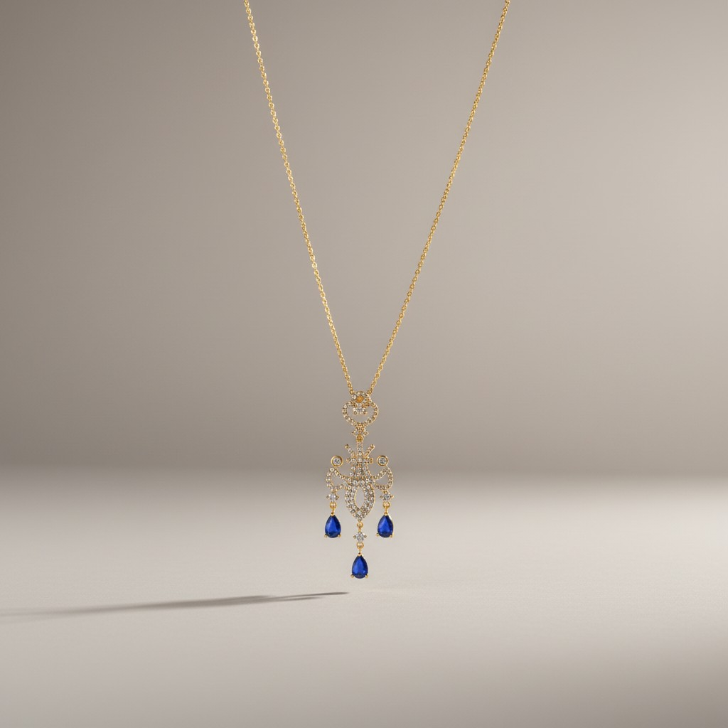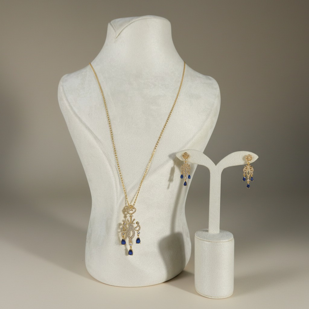 طقم فاخر مطلي بالذهب بتصميم طويل أنيق يجمع بين التفاصيل الكلاسيكية واللمسة الملكية الراقية. يتميز العقد بسلسلة ذهبية ناعمة تنتهي بتعليقة مزخرفة بتفاصيل دقيقة مستوحاة من التصاميم الكلاسيكية الفاخرة، تتدلى منها قطرات زرقاء عميقة تضيف لمسة لون راقية تعكس فخامة التصميم.