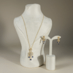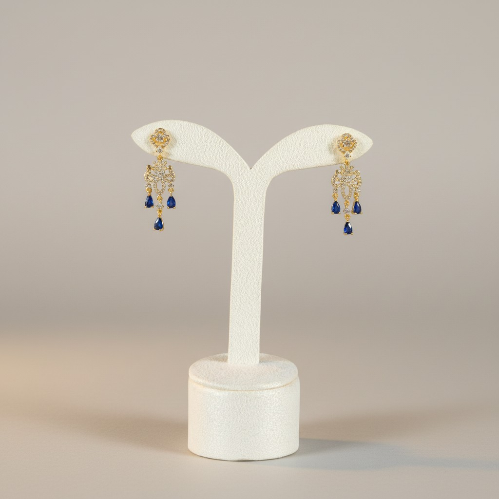 تأتي الأقراط بتصميم متناسق يحمل نفس الزخارف الفاخرة مع قطرات زرقاء متدلية، ليكتمل الطقم بتناغم أنيق يمنح الإطلالة حضوراً مميزاً ولمسة فخامة مثالية للمناسبات والسهرات الراقية